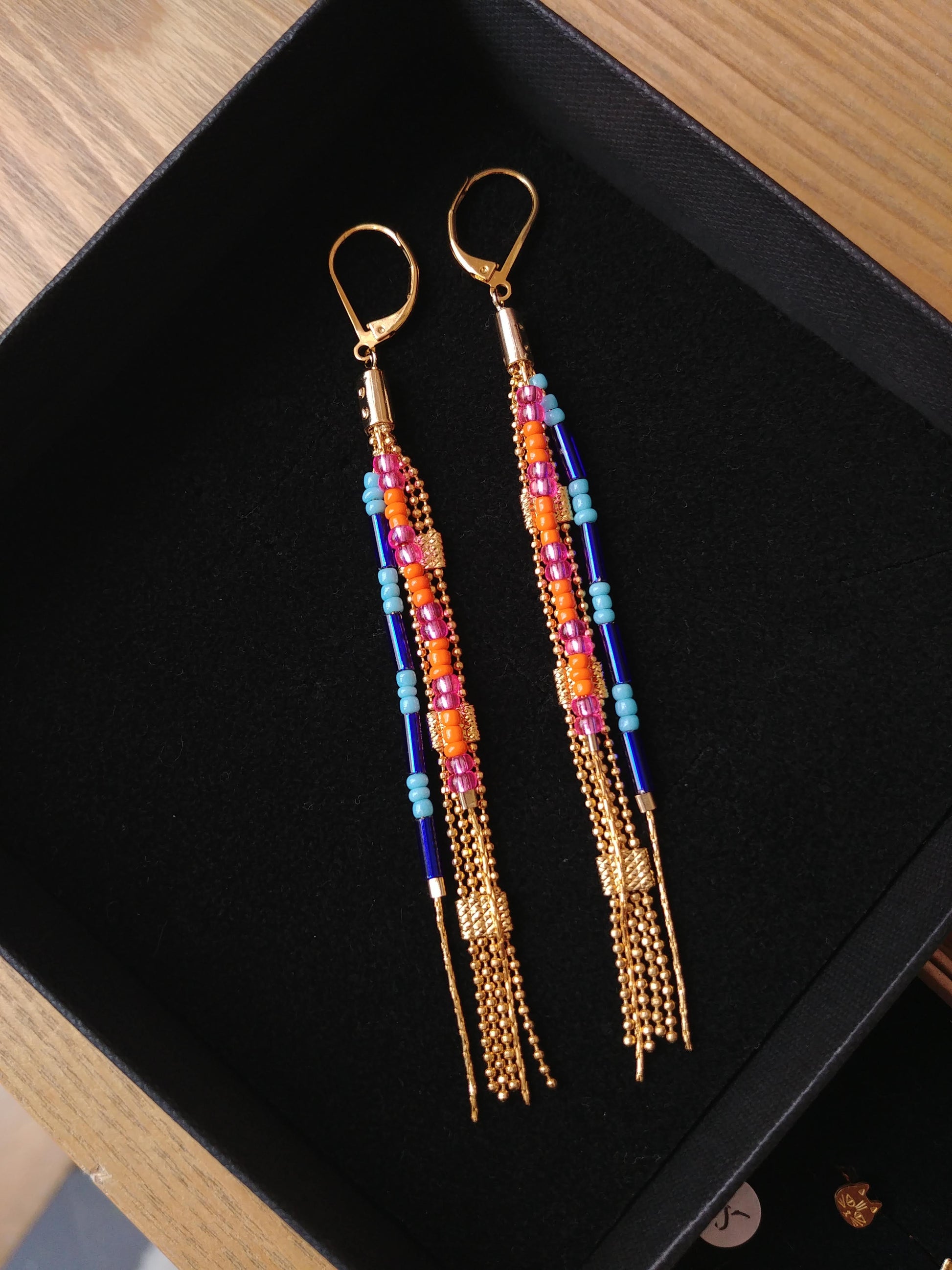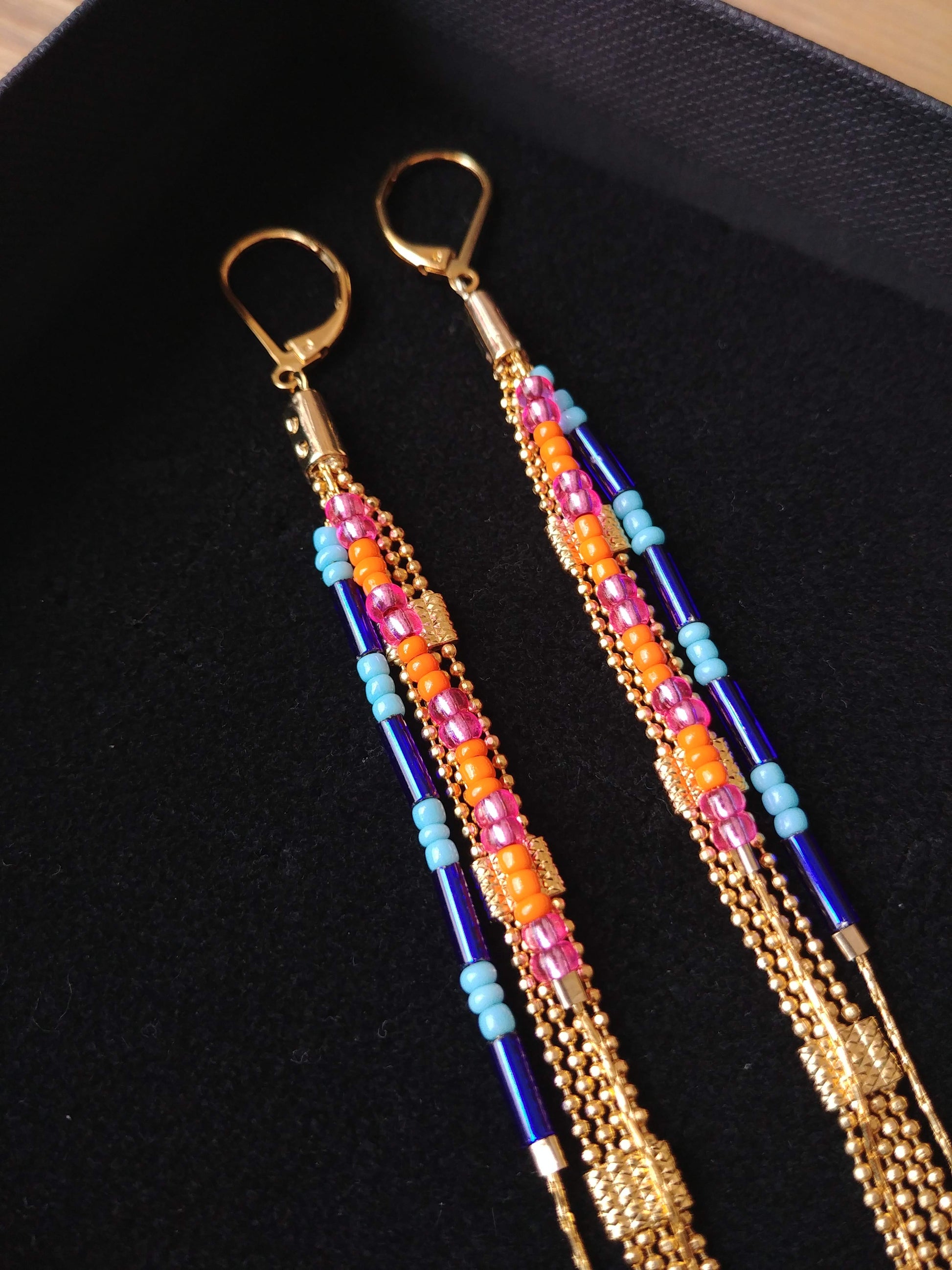 Boucles d'oreilles longues et fluides, très originale s et élégantes constituées d'une belle association de chaine dorée à l'or fin et des perles de rocailles colorées.