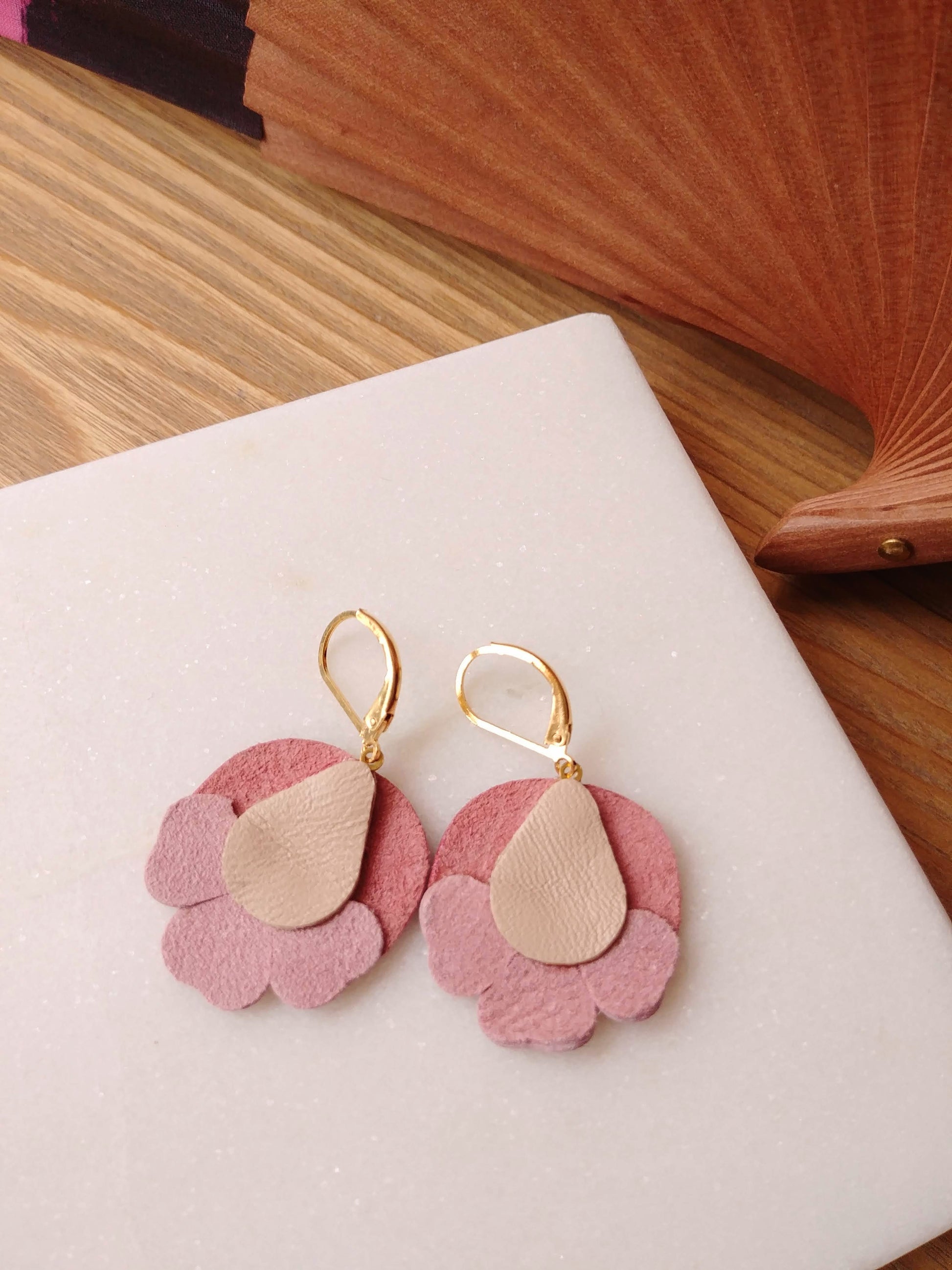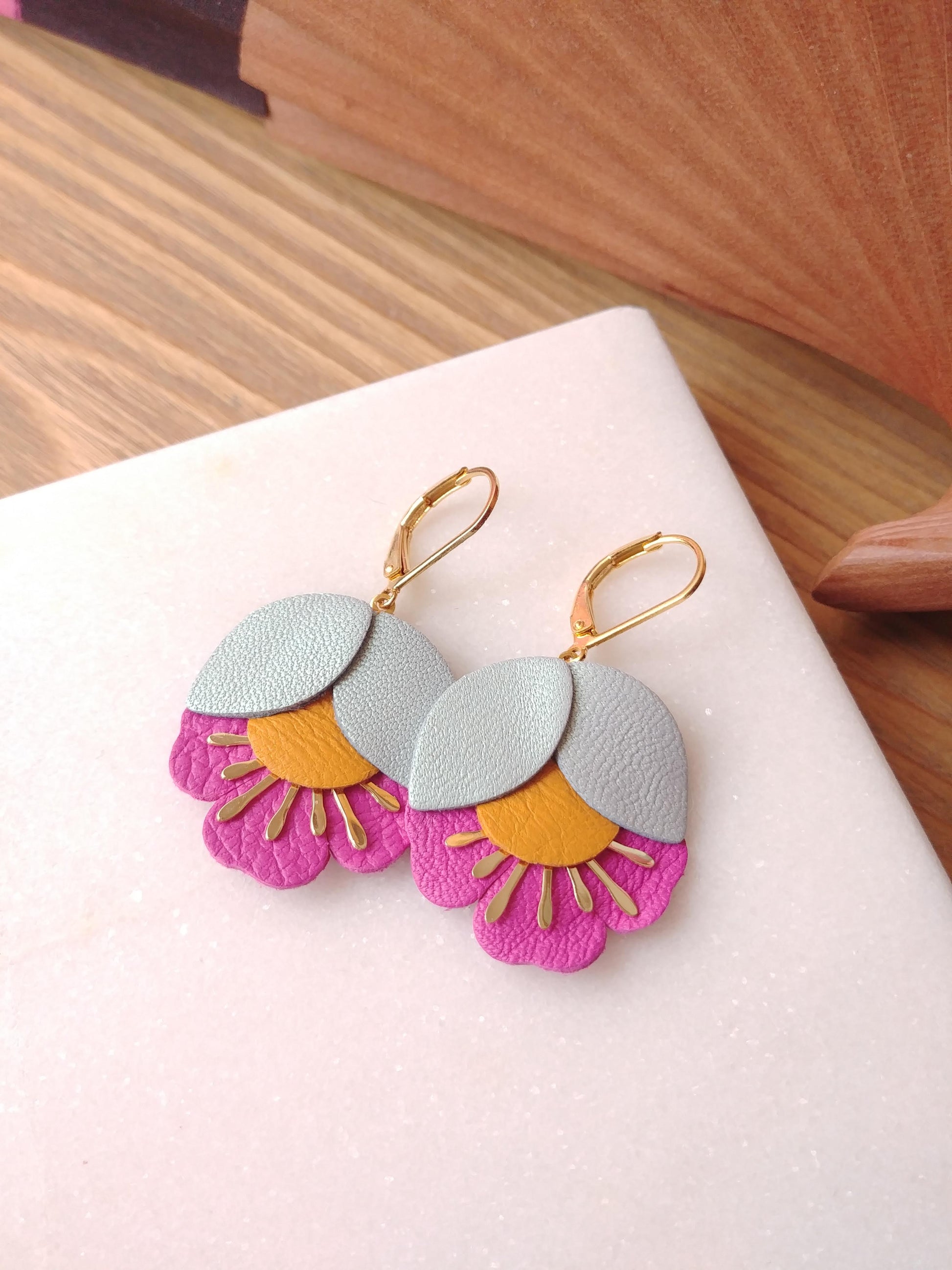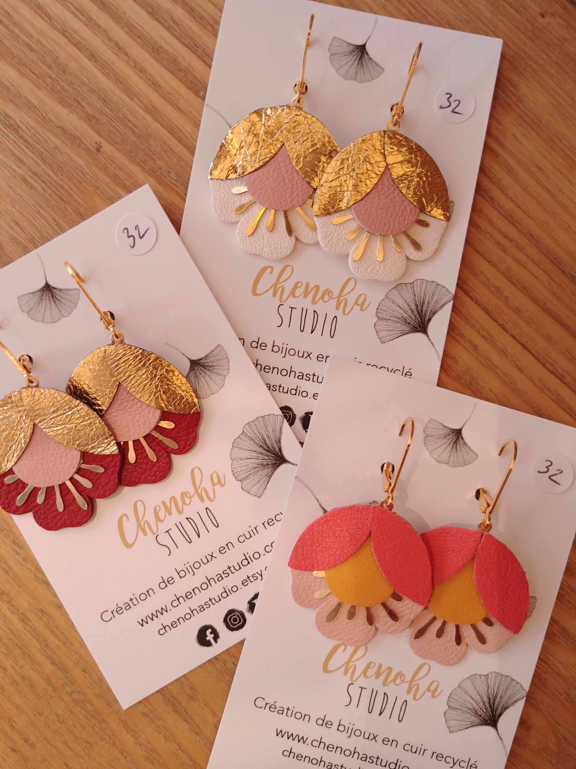 Boucles d'oreilles en cuir très légères de la marque française Chenoha studio. Mélange de cuir de couleur et de motif en laiton découpé au lazer et doré à l'or fin.