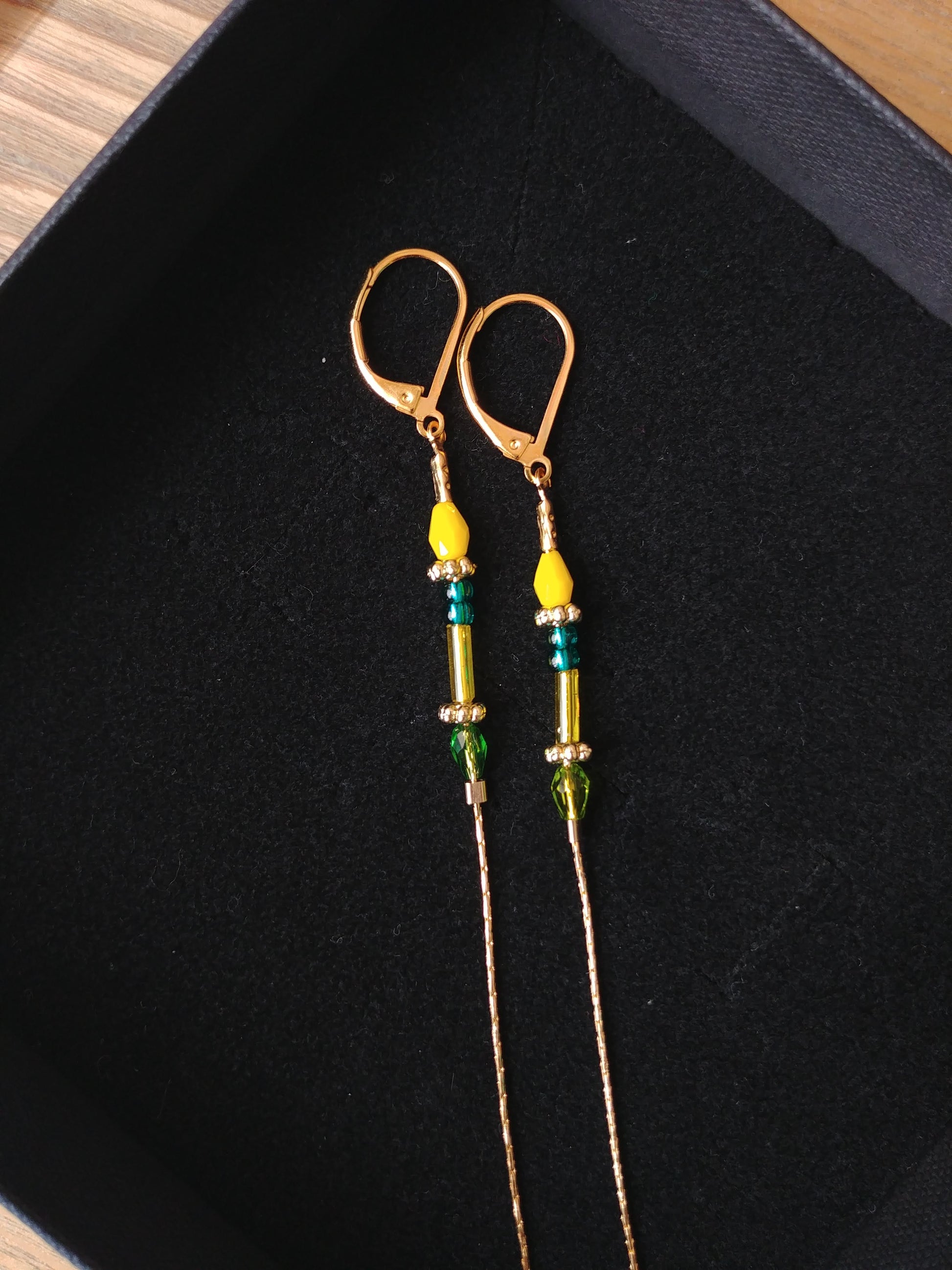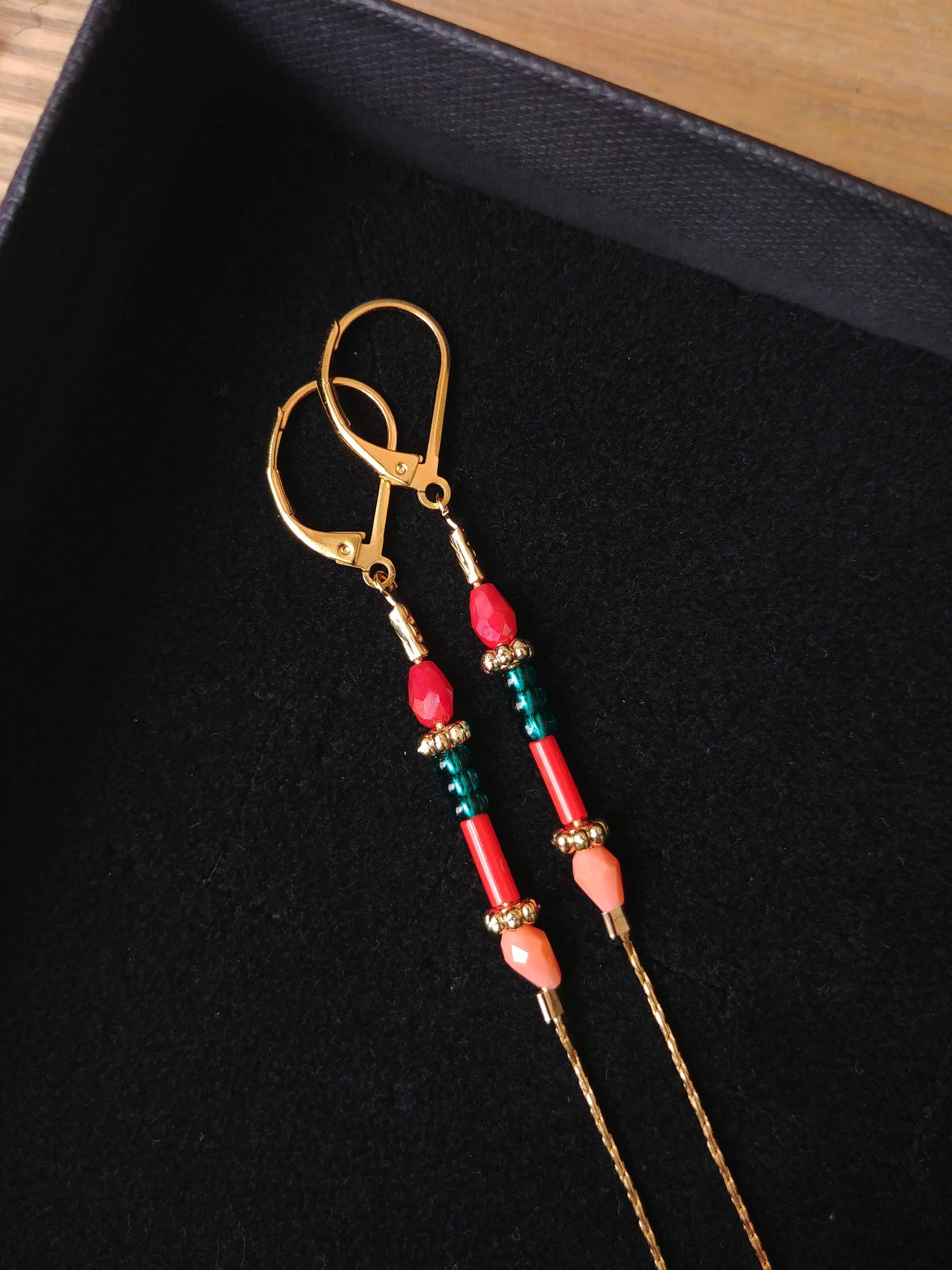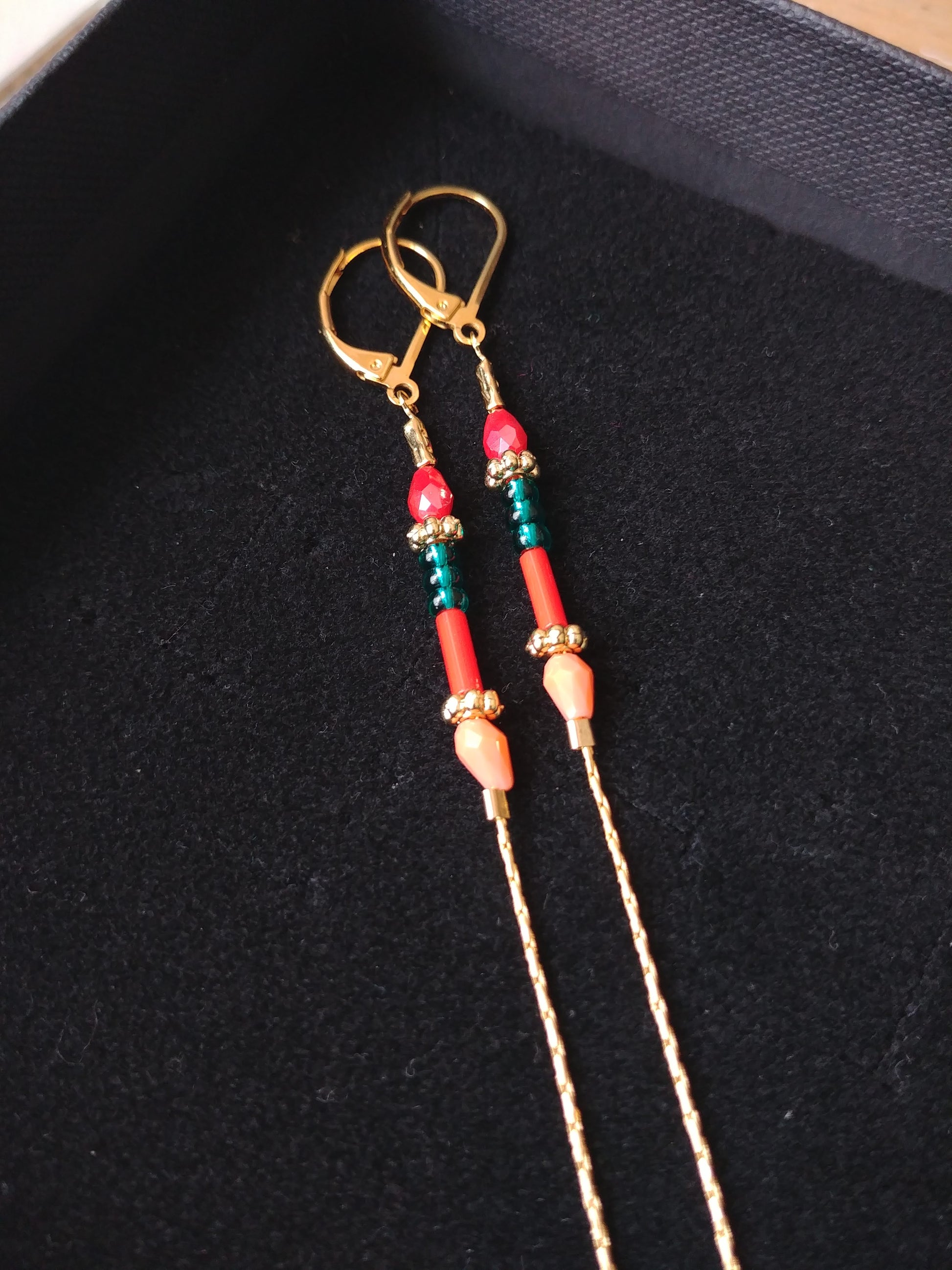 Boucles d'oreilles longues et fines, très délicates et élégantes constituées d'une belle association de chaine serpentine en laiton doré à l'or fin et de petites perles de verre très colorées.