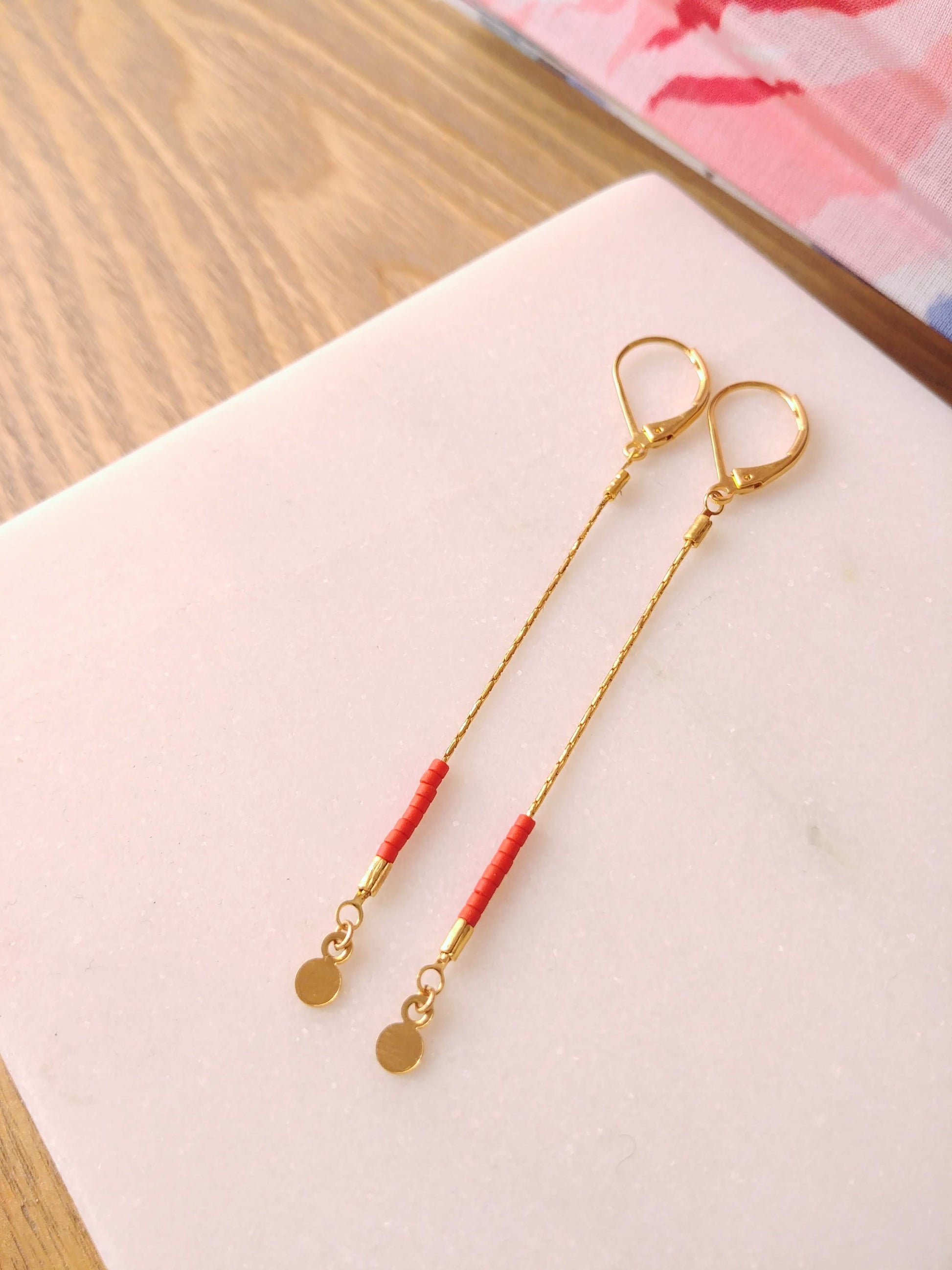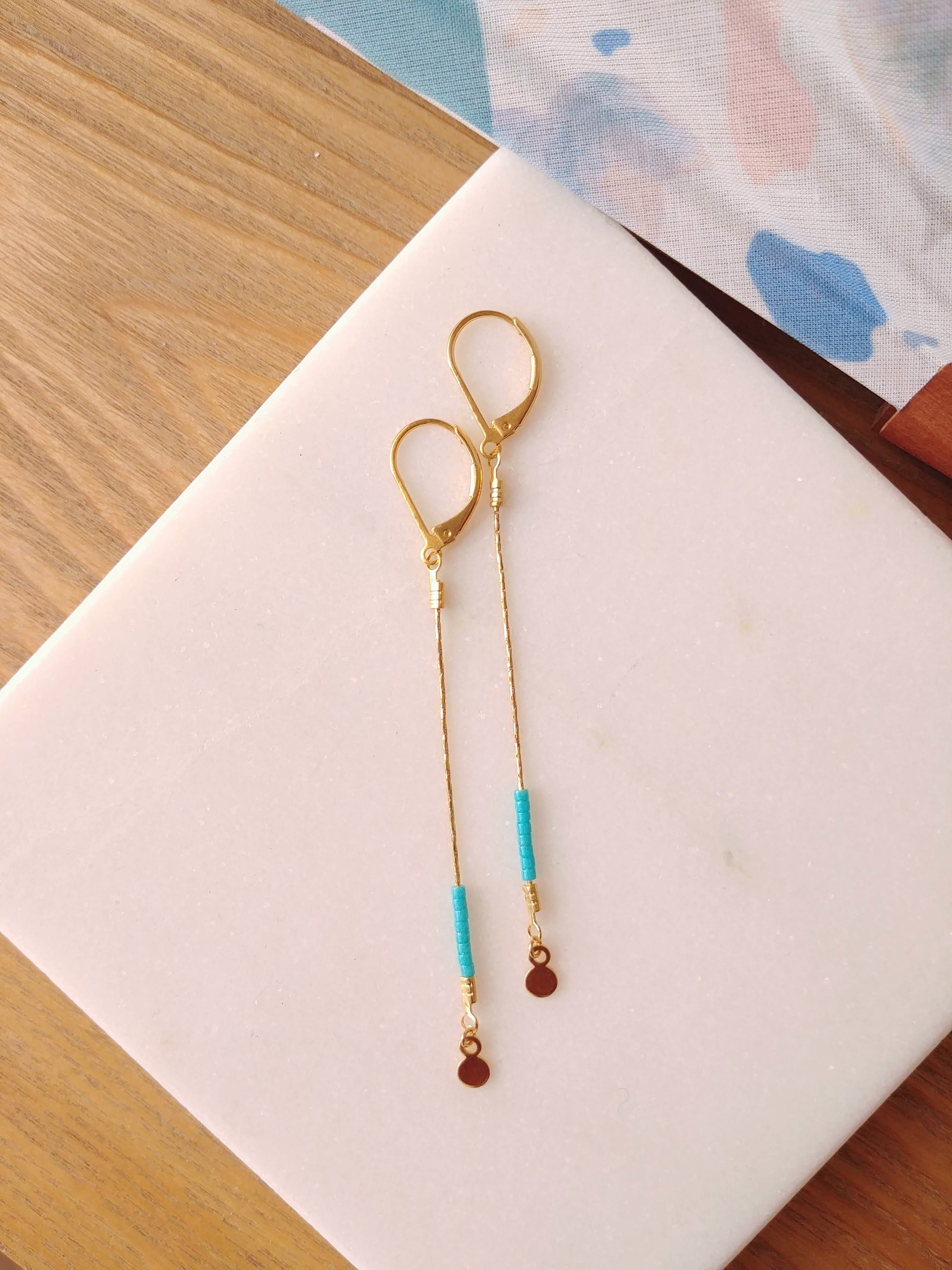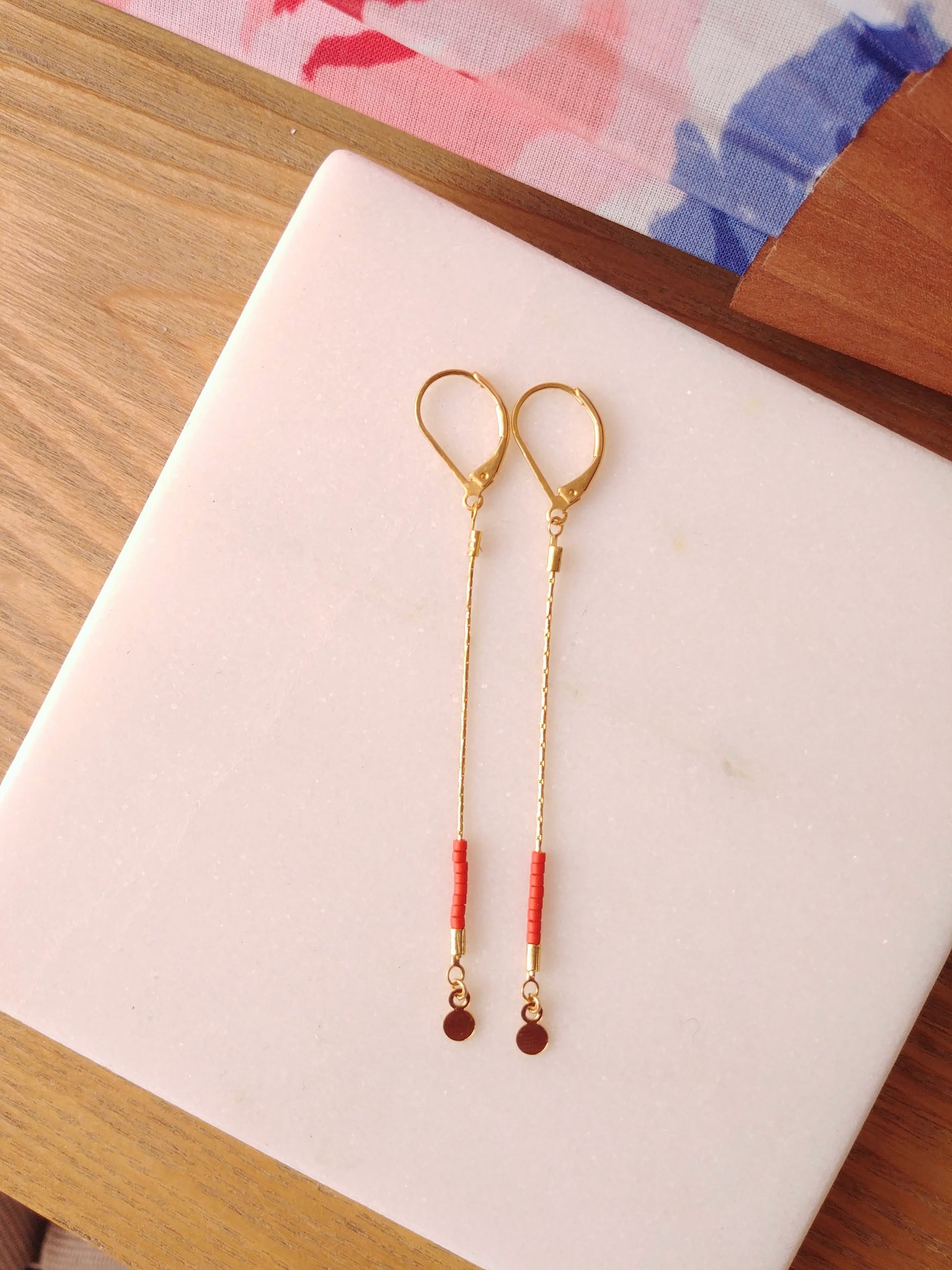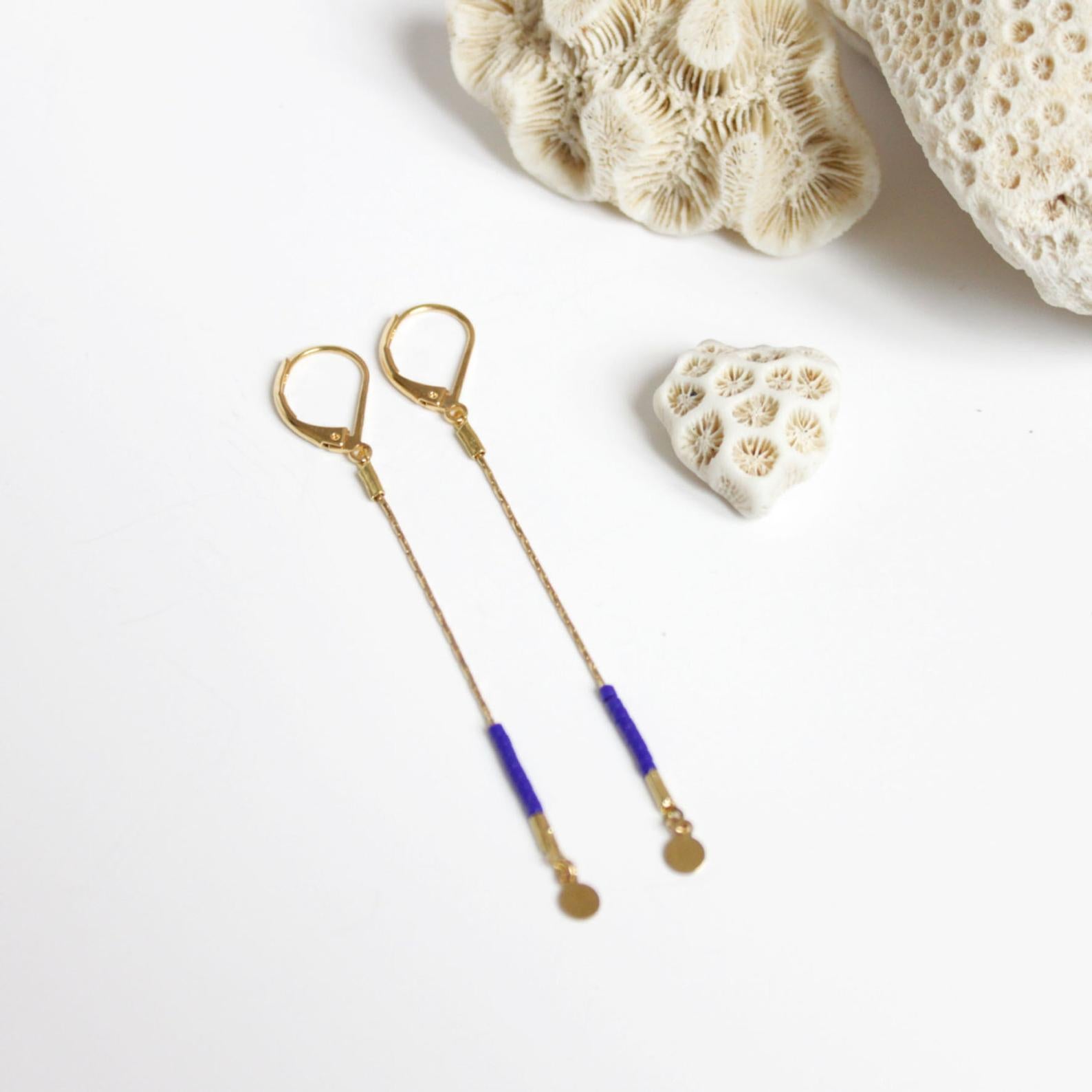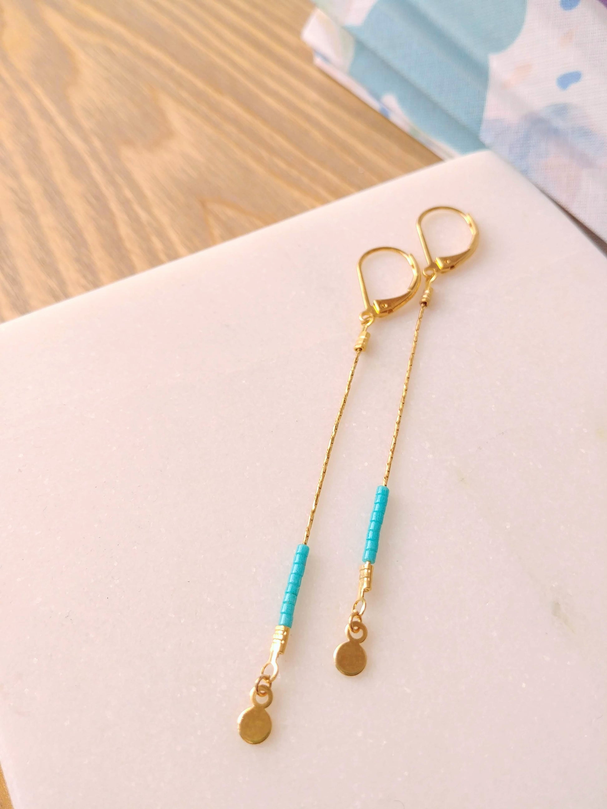 Ces boucles d'oreilles sont composées de perles très fines (perles japonaises miyuki) enfilées sur une chaîne serpentine en laiton doré, petite pastille doré en finition. Montures dormeuses en laiton doré.