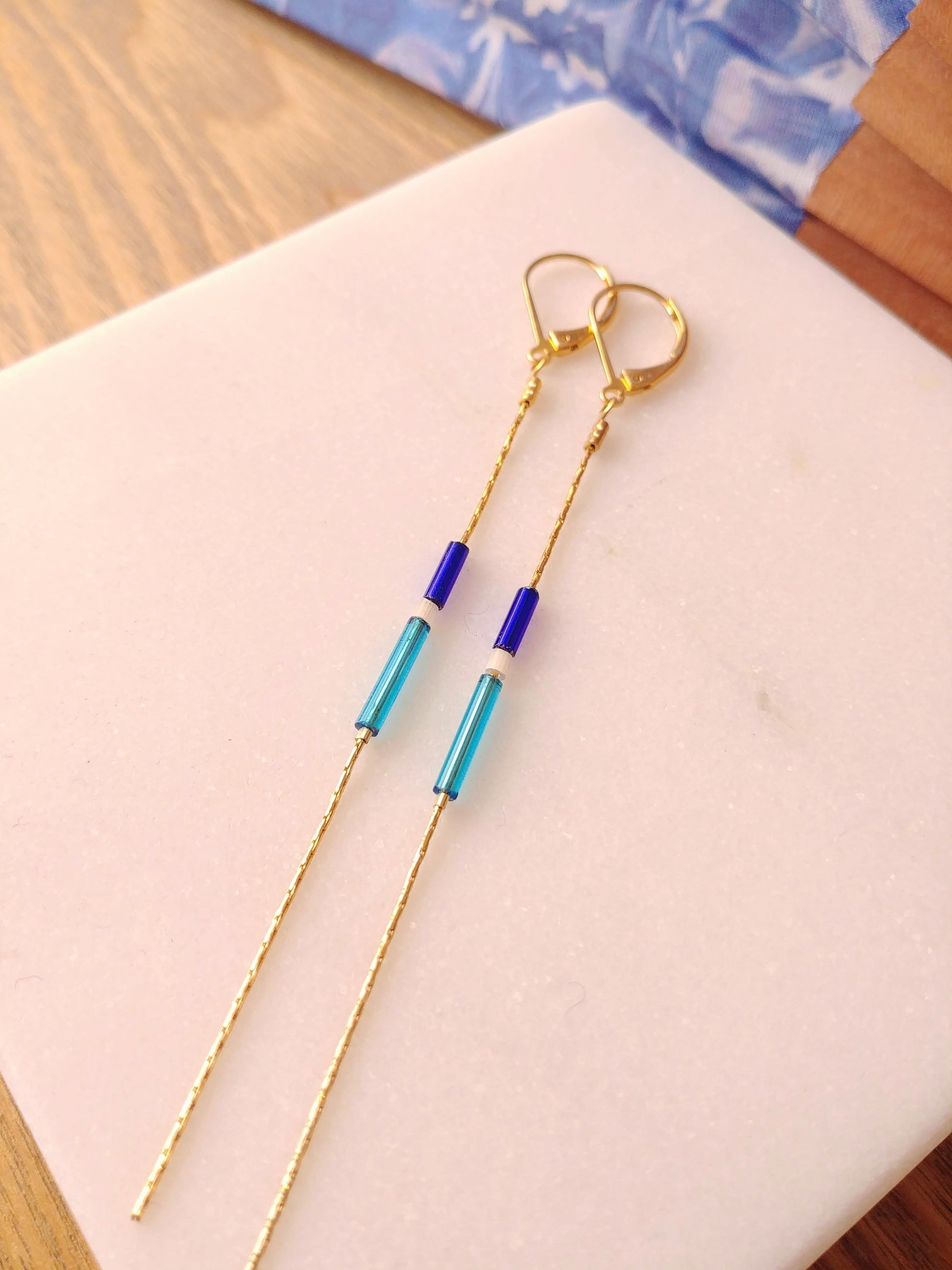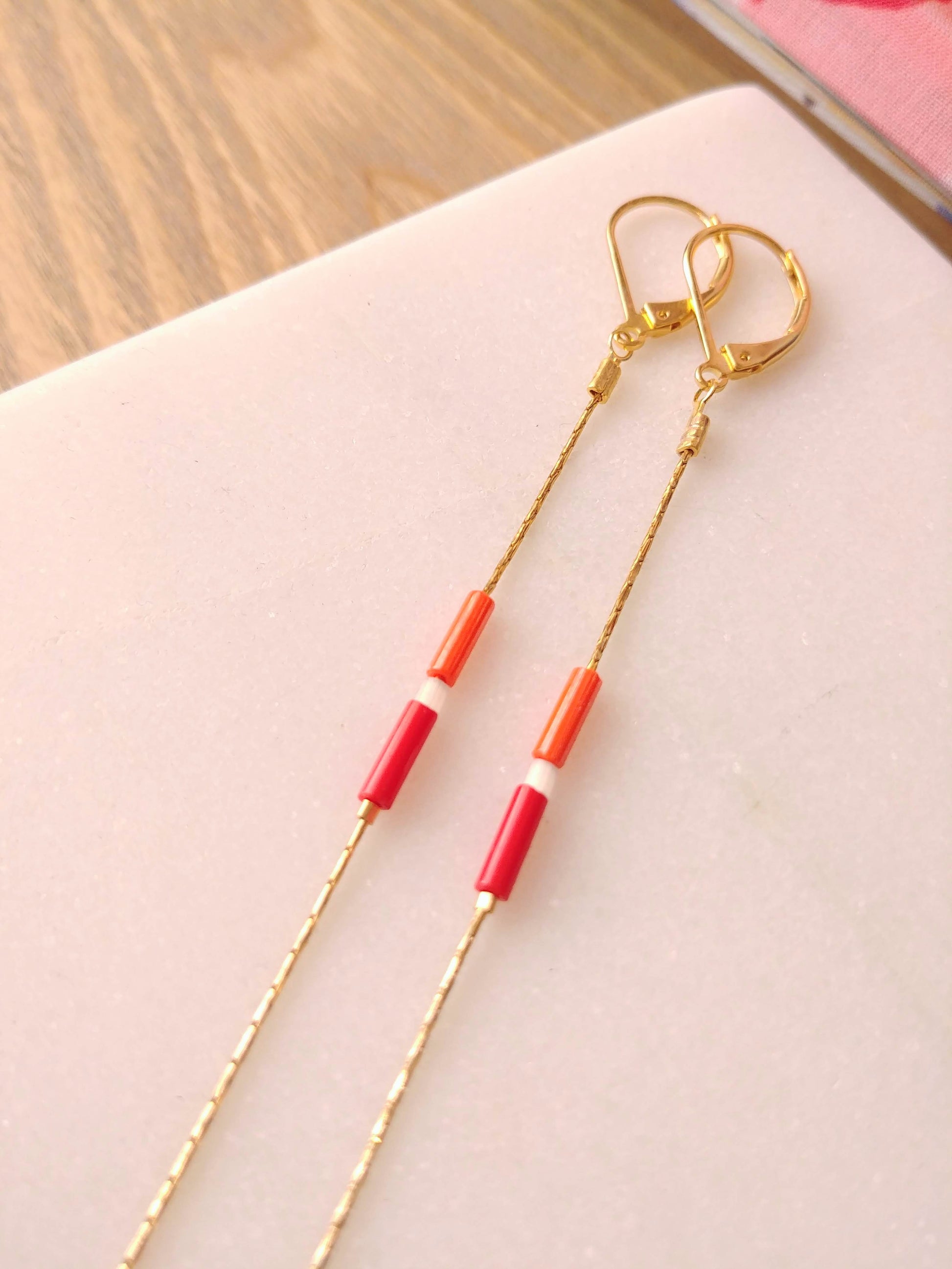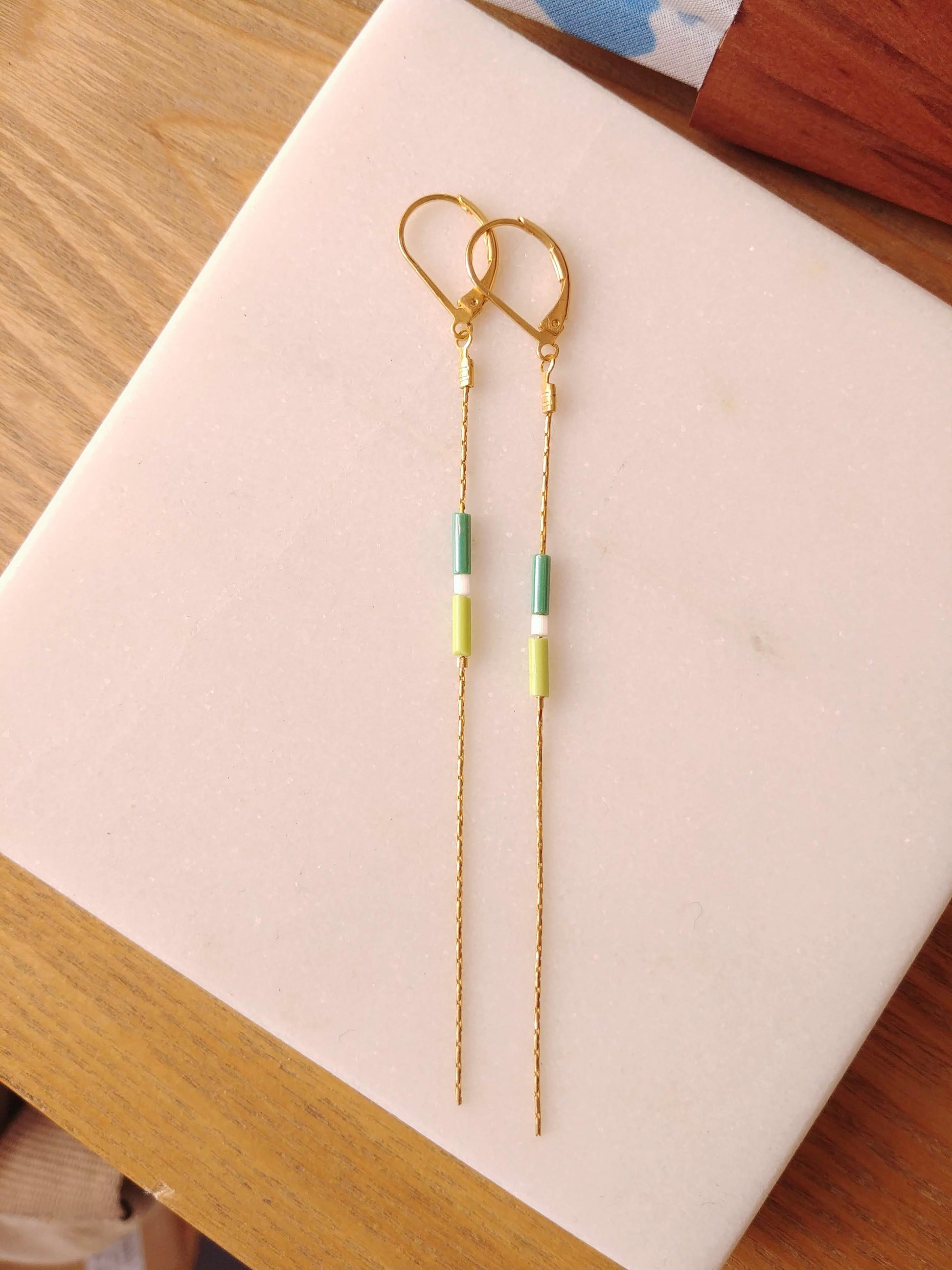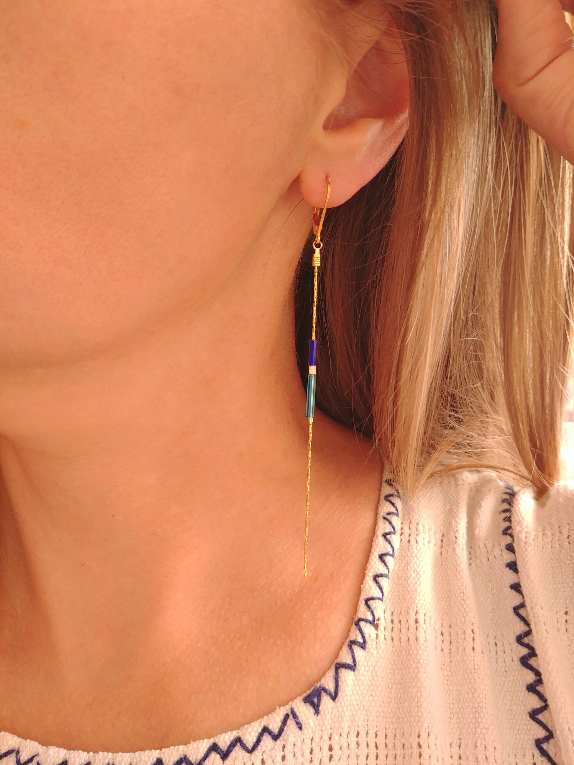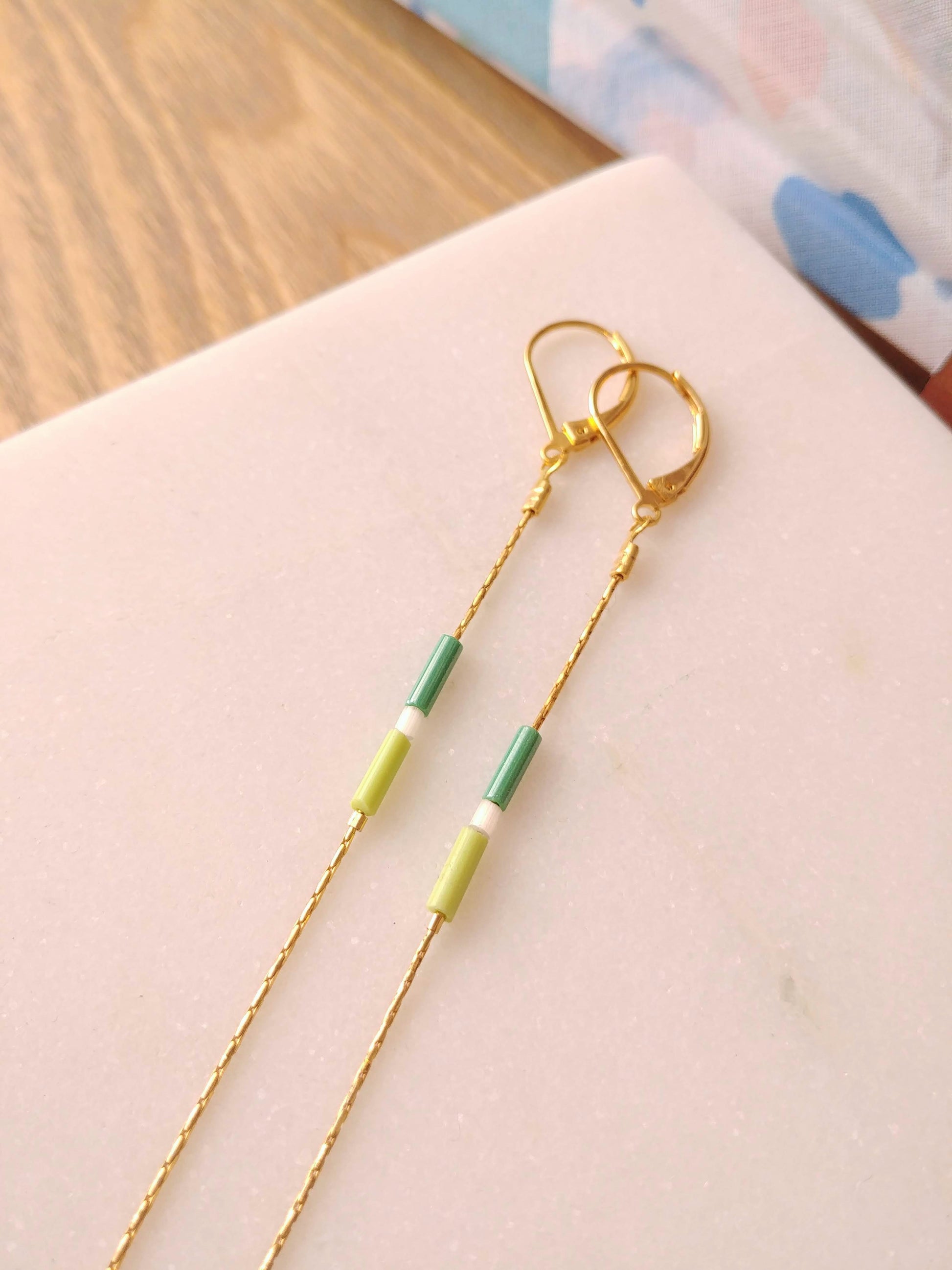Jolies boucles d'oreilles en laiton doré à l'or fin. La chaine fine en maille serpentine est réhaussée de queques perles tubulaires en camaïeu.
