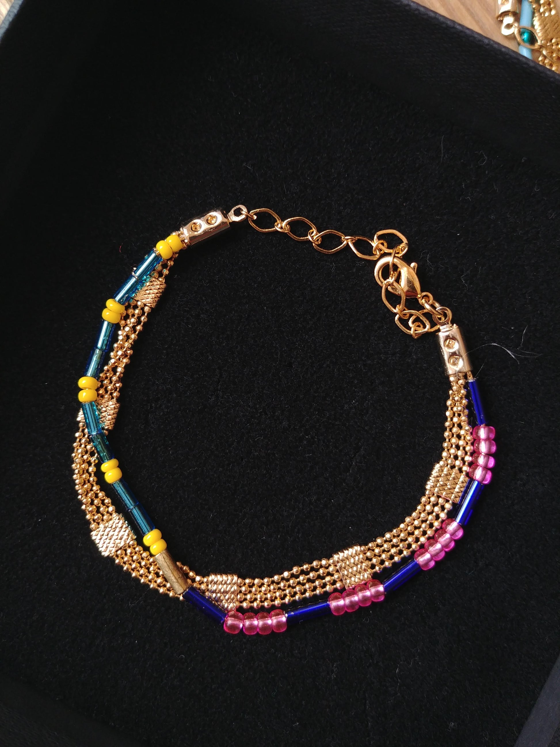 Ambiance estivale et lumineuse pour vos poignets dorés. Ce joli bracelet Copacabana accompagnera n'importe qu'elle tenue, décontractée ou plus habillée avec sa belle association d'une chaine dorée à l'or fin et des perles de rocailles ultra colorées.
