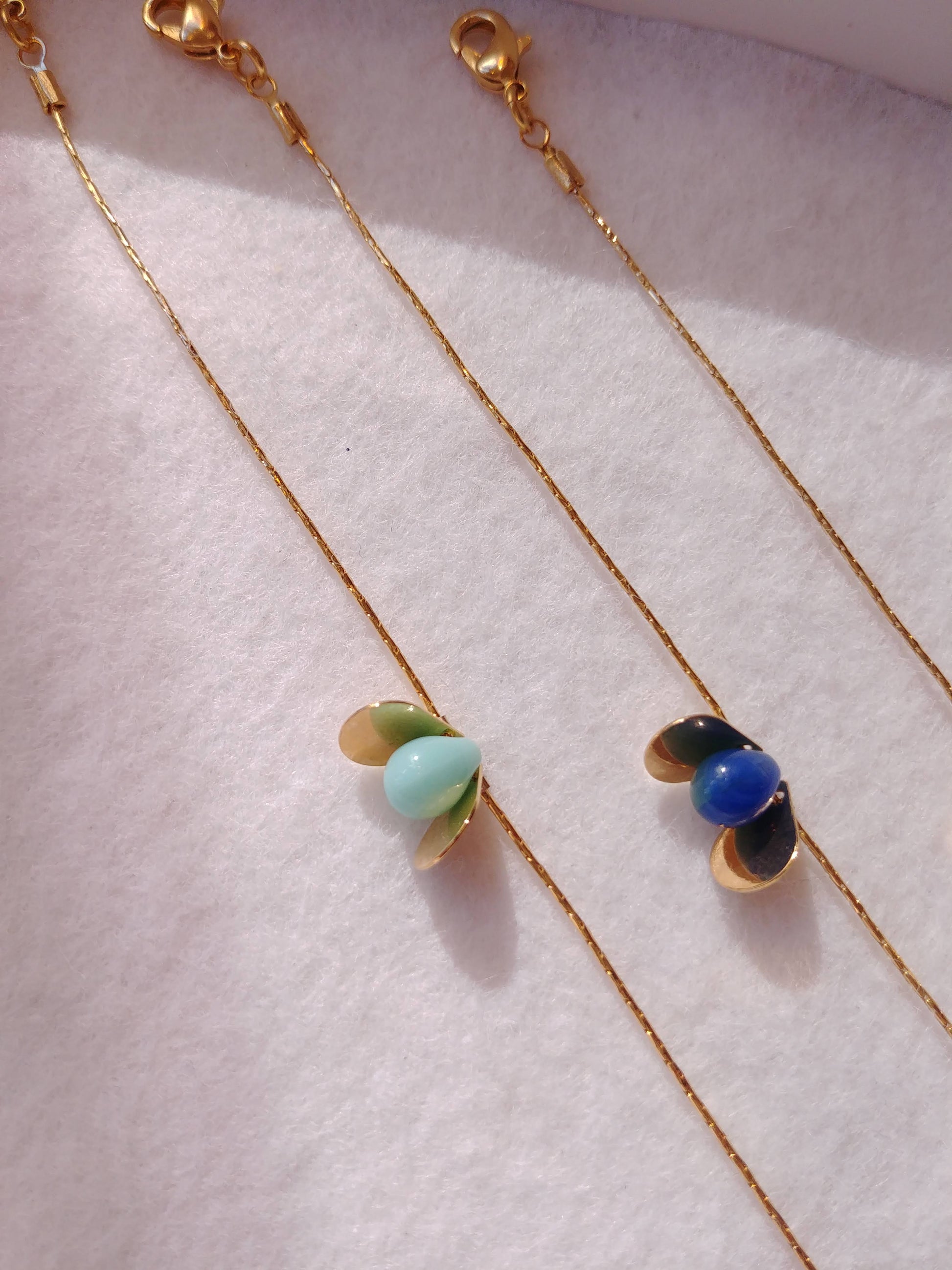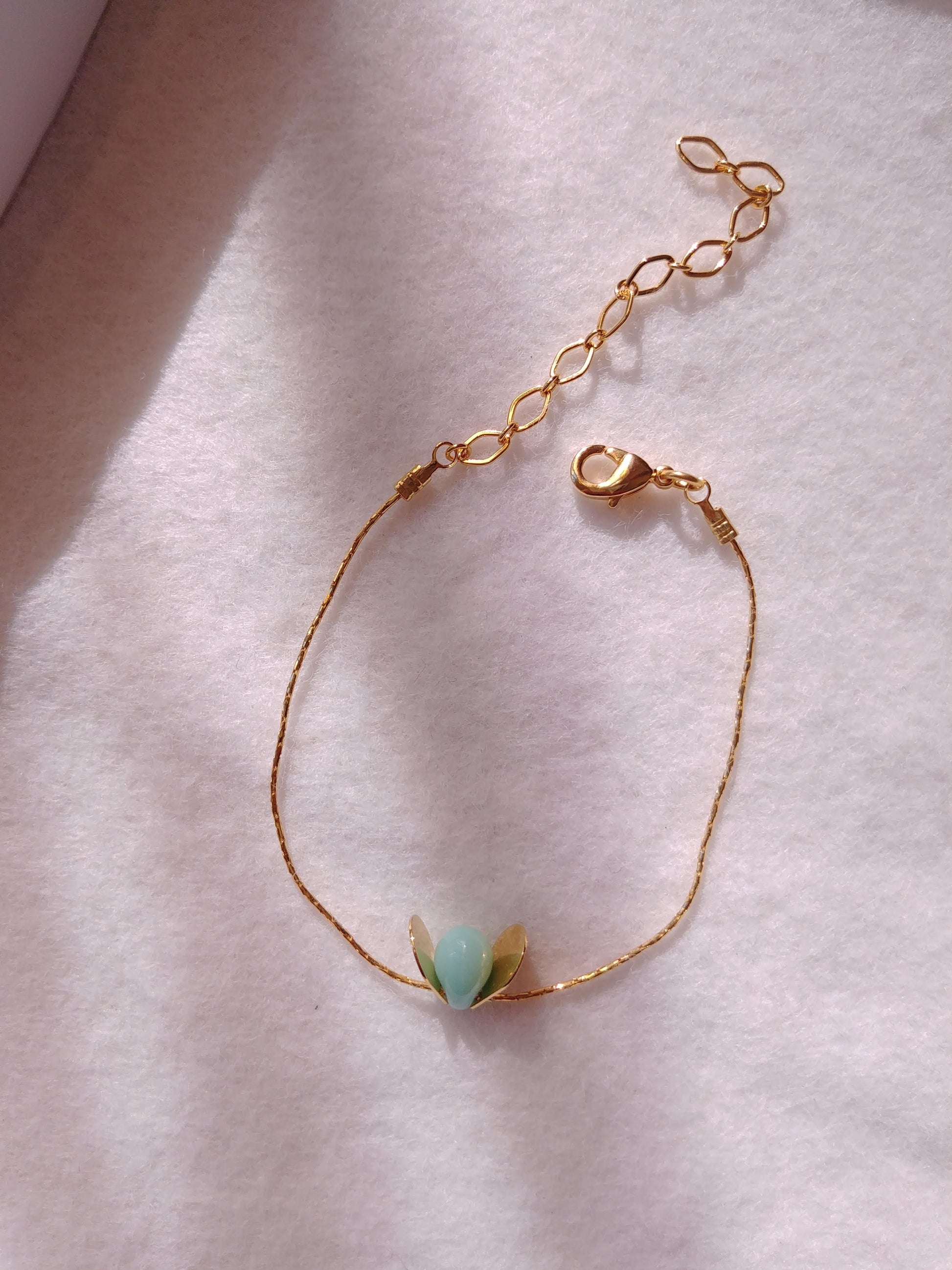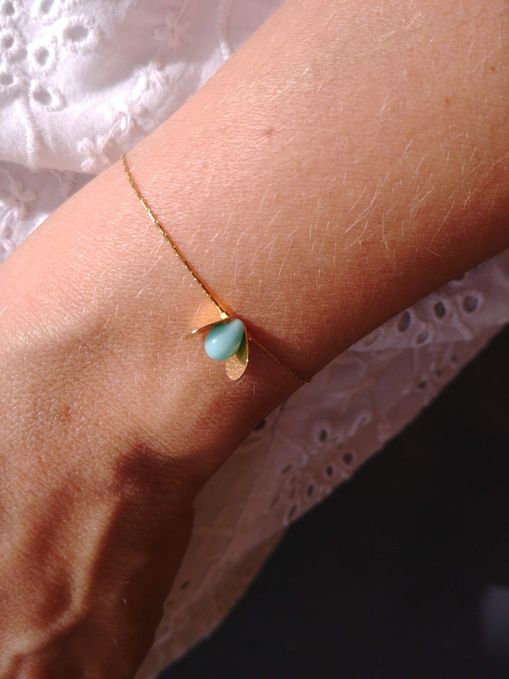 petit bracelet très fin composé d'une chaine serpentine en laiton doré à l'or fin sur lequel est enfilé une perle de verre et deux gouttes en métal doré.