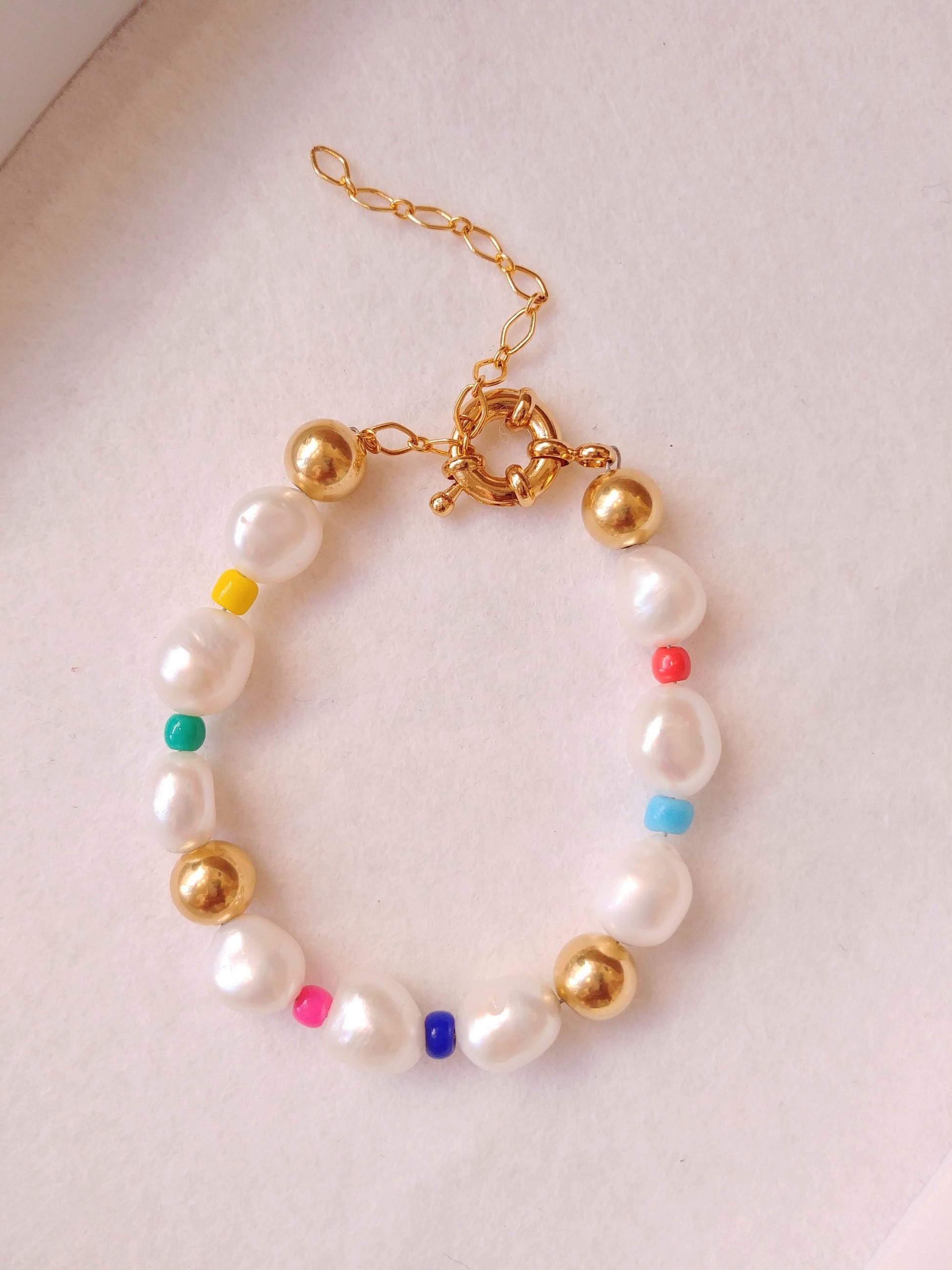 Le bracelet lollipop est composé de perles d'eau douce blanche, de perles de métal plaquée or et de petites perles de couleurs vives en verre ou en plastique.