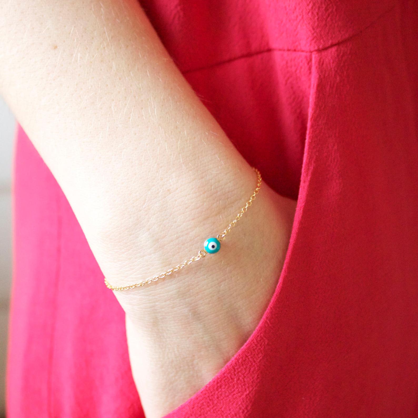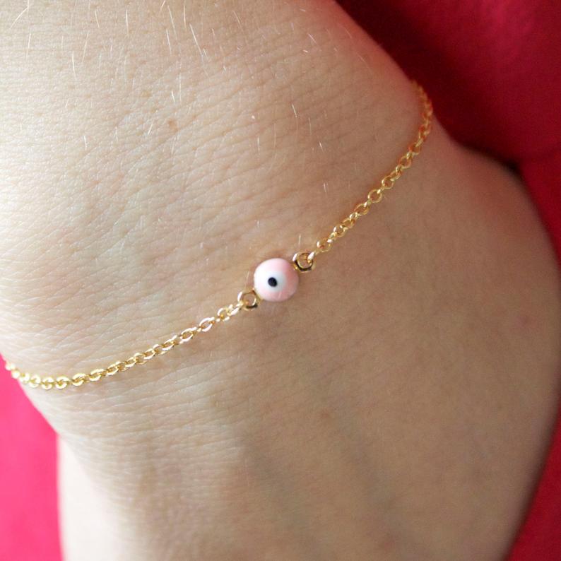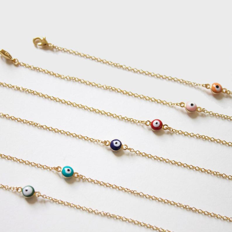 Ce petit bracelet très fin en laiton doré, fera un parfait grigri porte bonheur. Son oeil en émail de différentes couleurs veillera sur vous tout en beauté et élégance.