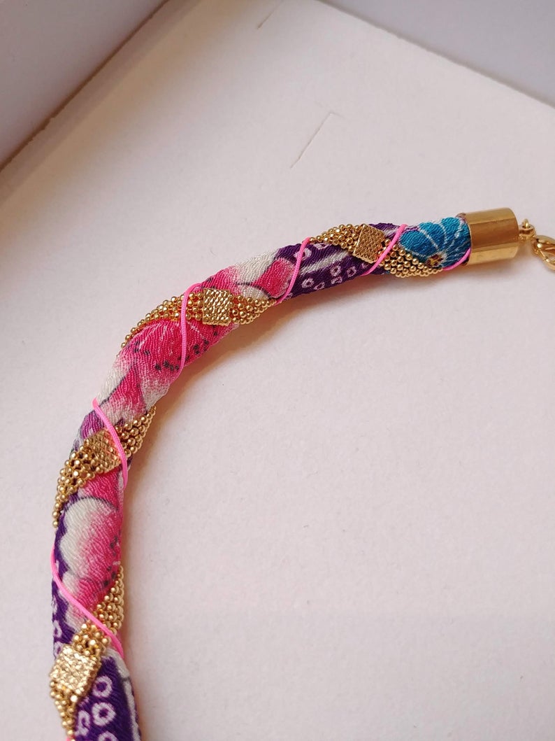 Ce collier est composé d'un lien épais en tissus japonais sur lequel est enroulée une chaine fantaisie en laiton doré à l'or fin. Un petit fil de nylon fluo maintient les éléments ensemble en toute originalité.