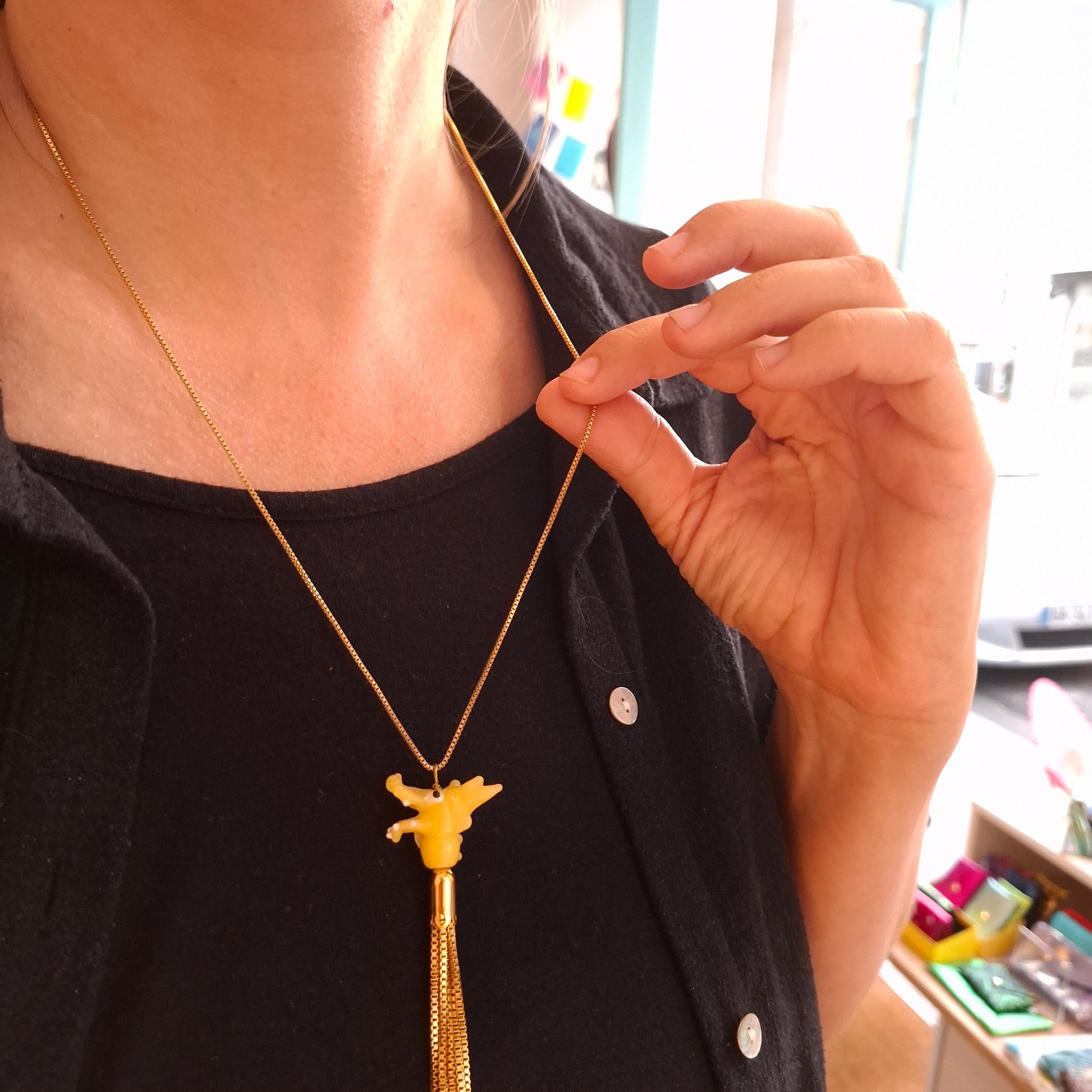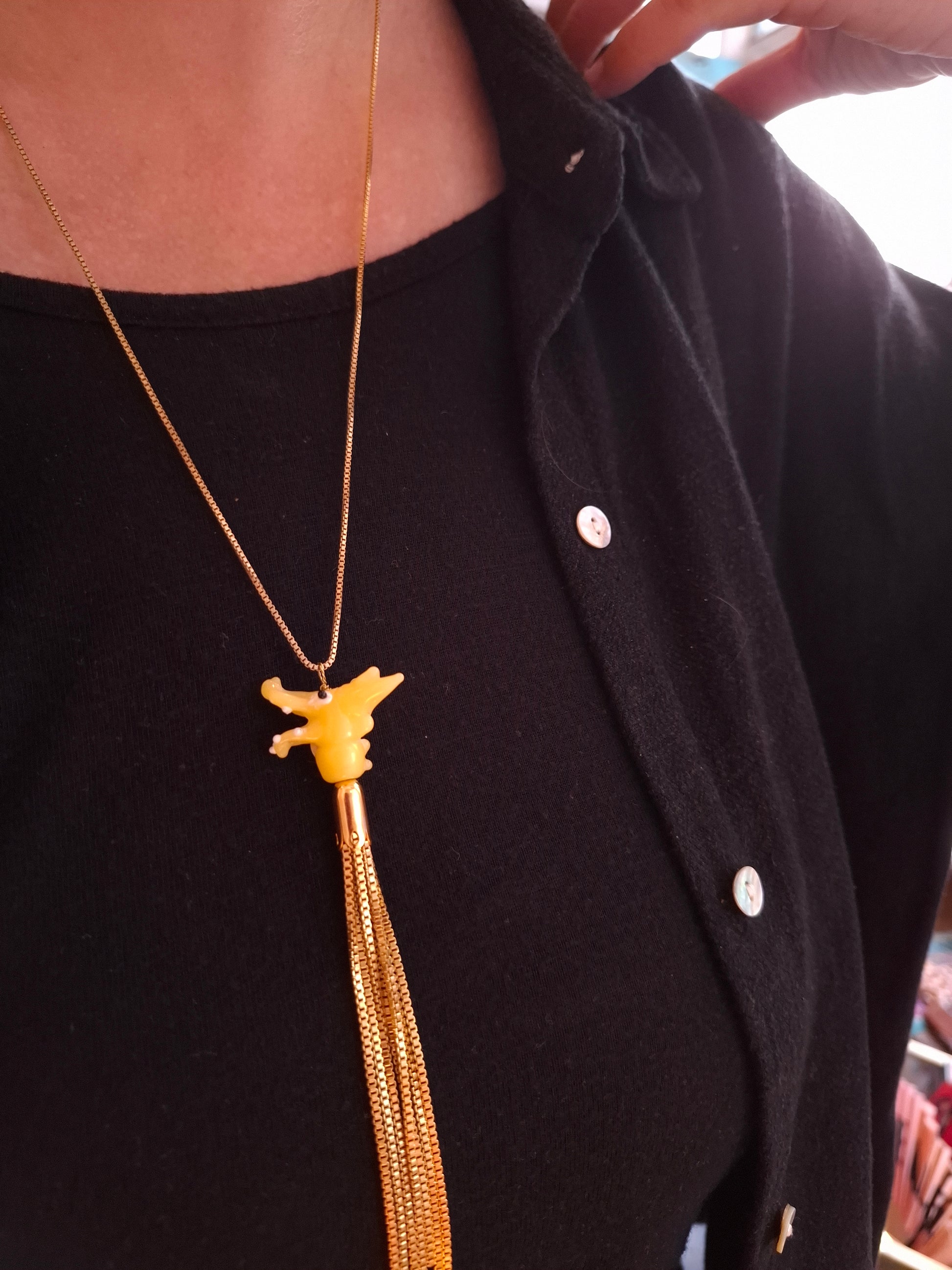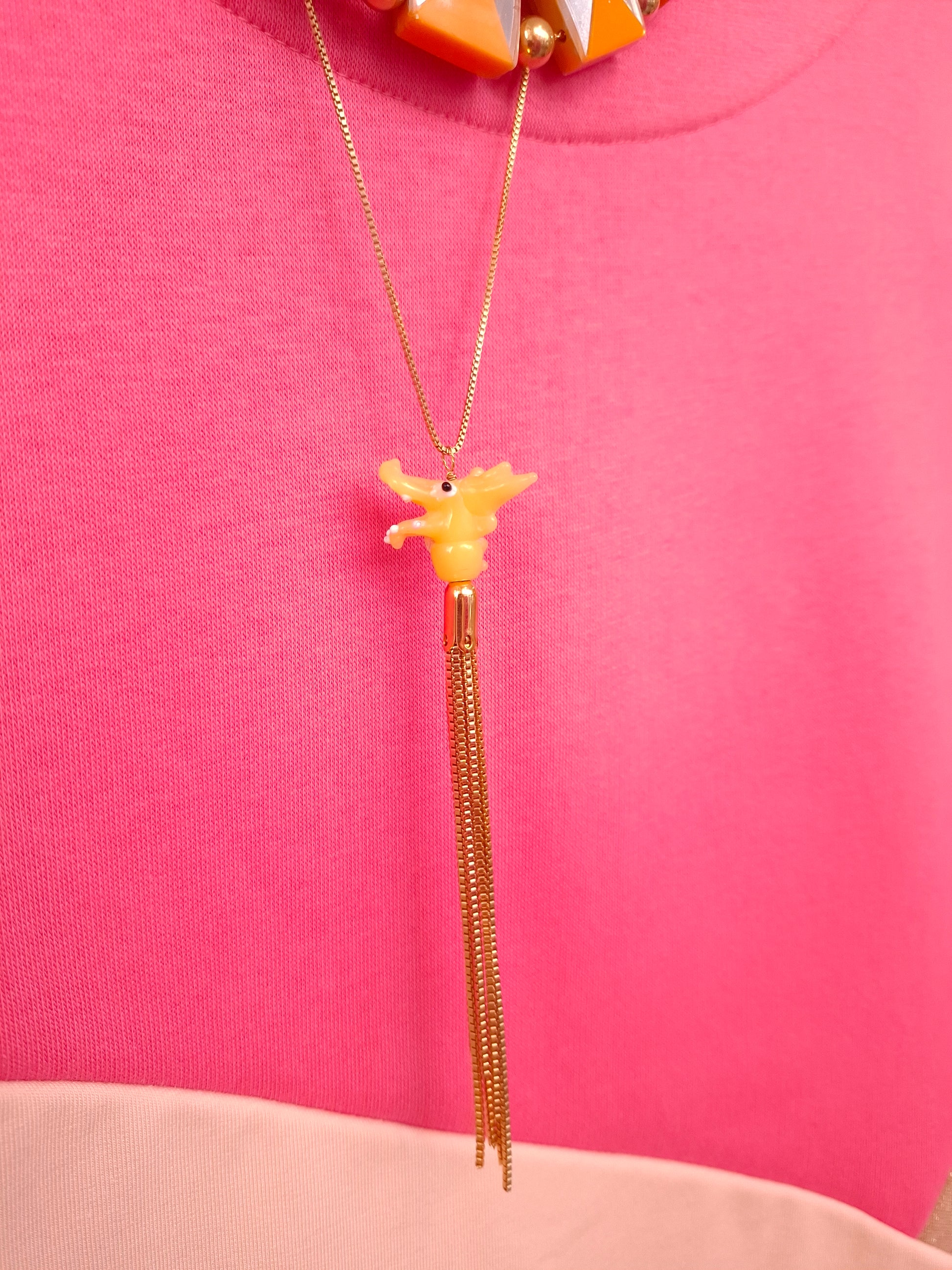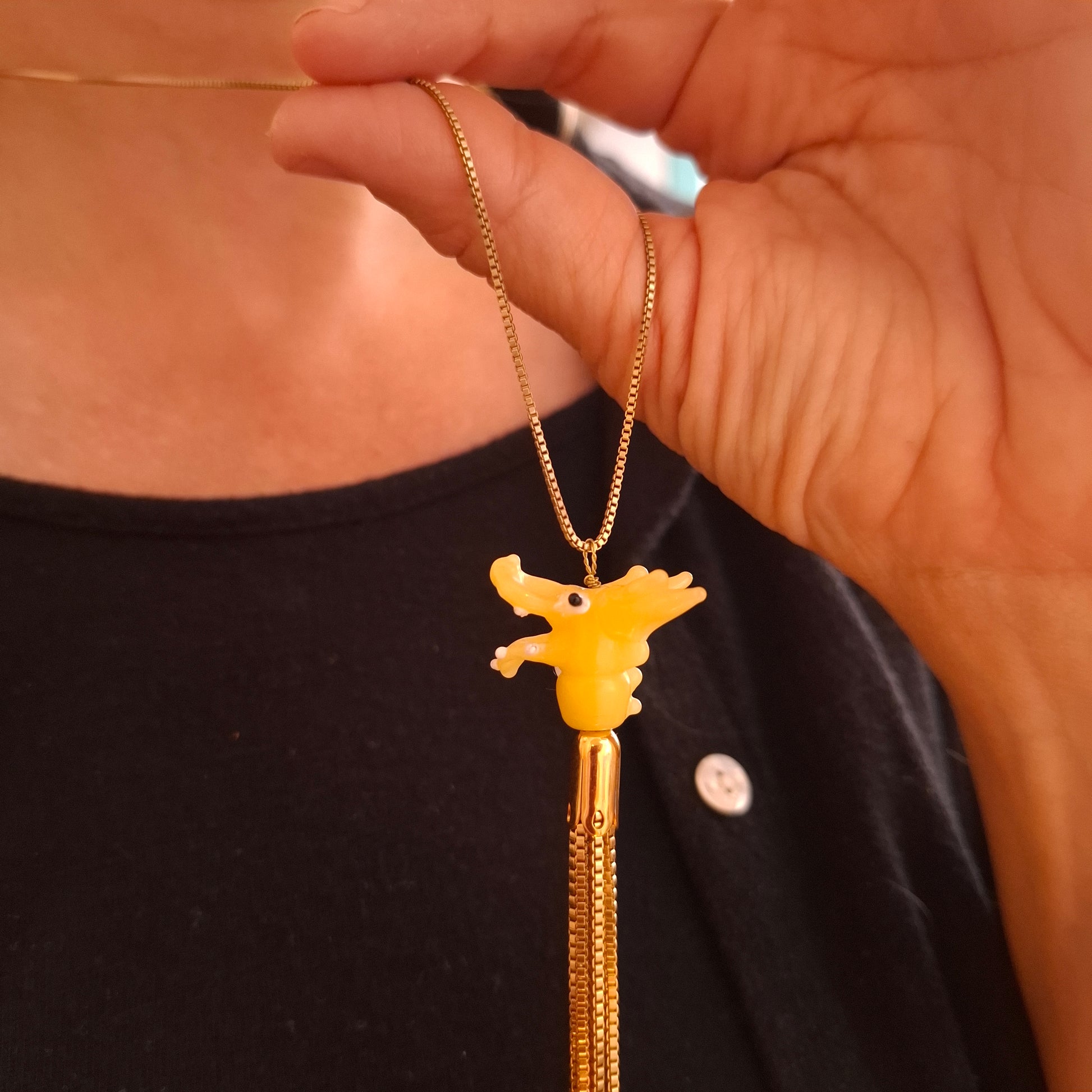 Pendentif en verre en forme de dragon monté sur une chaîne en laiton doré à ́or fin.