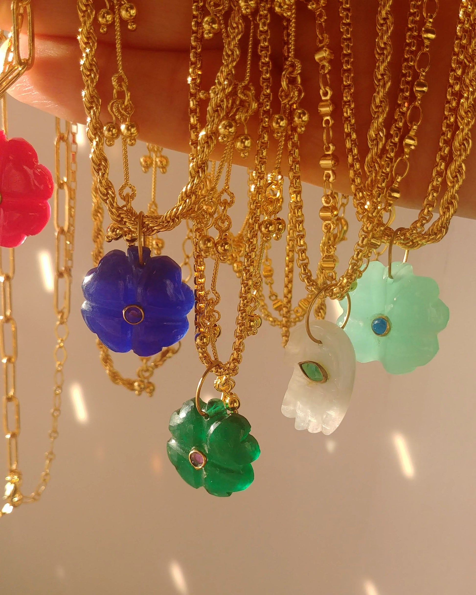 Chaque pendentif en pierre finement gravée est monté sur un duo de chaines en laiton doré à l'or fin.