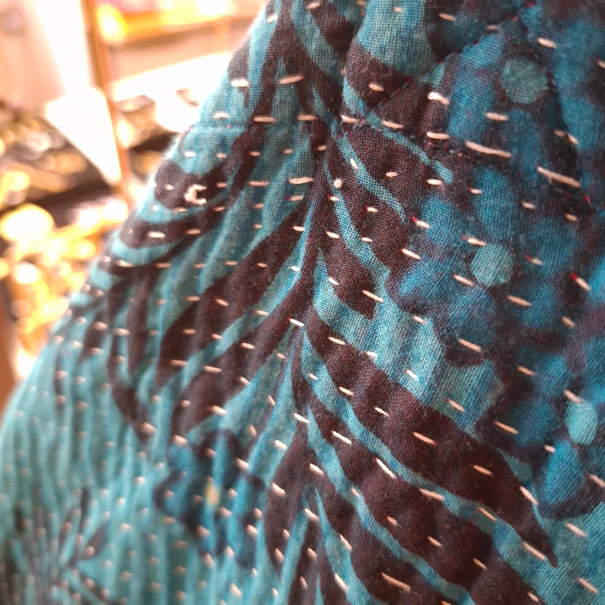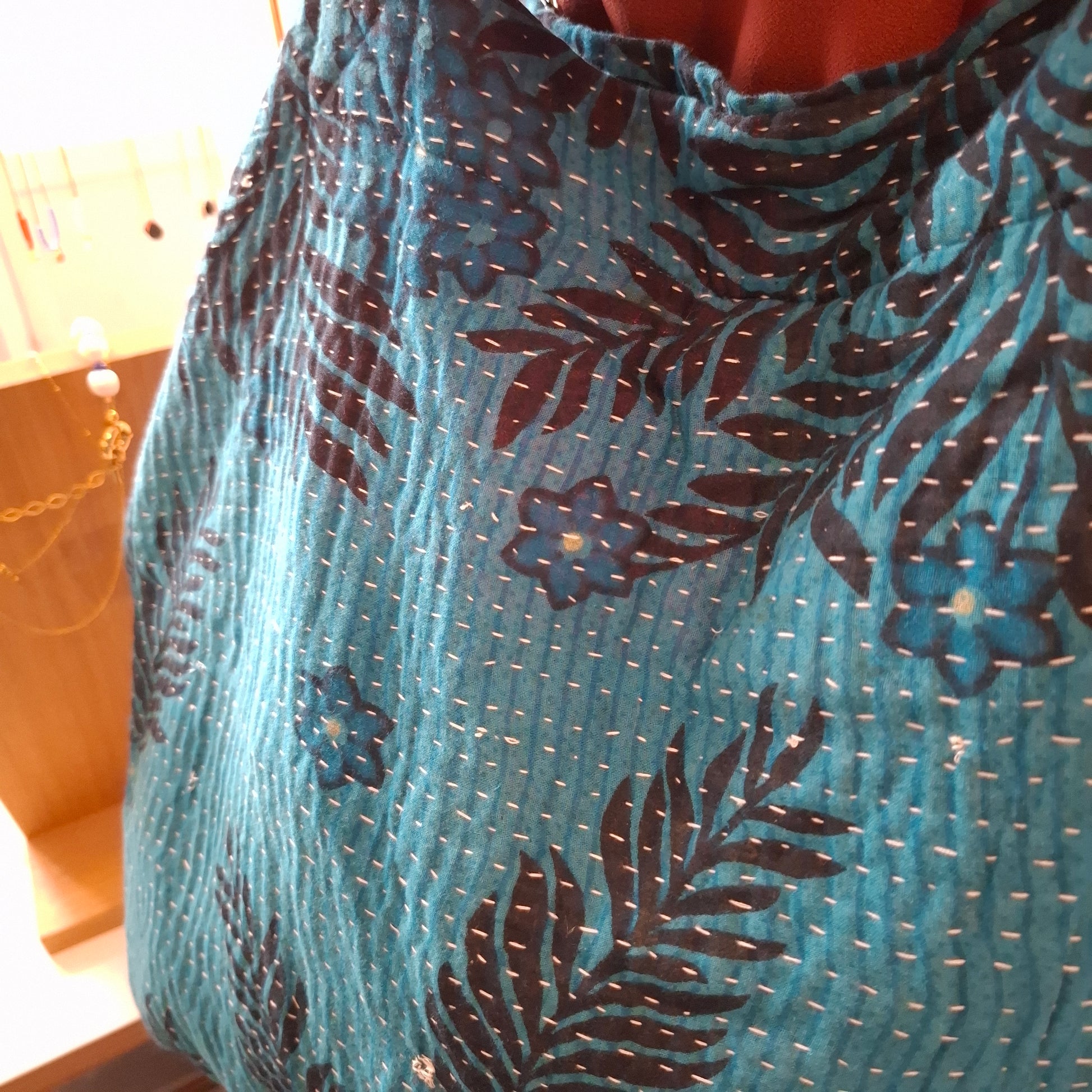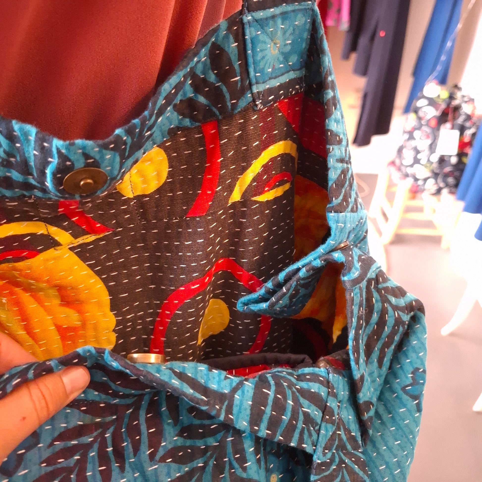 Le kantha est un tissus fait de l’association d’anciens saris indiens assemblés à la main et surpiqués patiemment. Ainsi chaque sac est unique et porte les traces de ce travail qui permet l’émancipation des femmes en Inde.