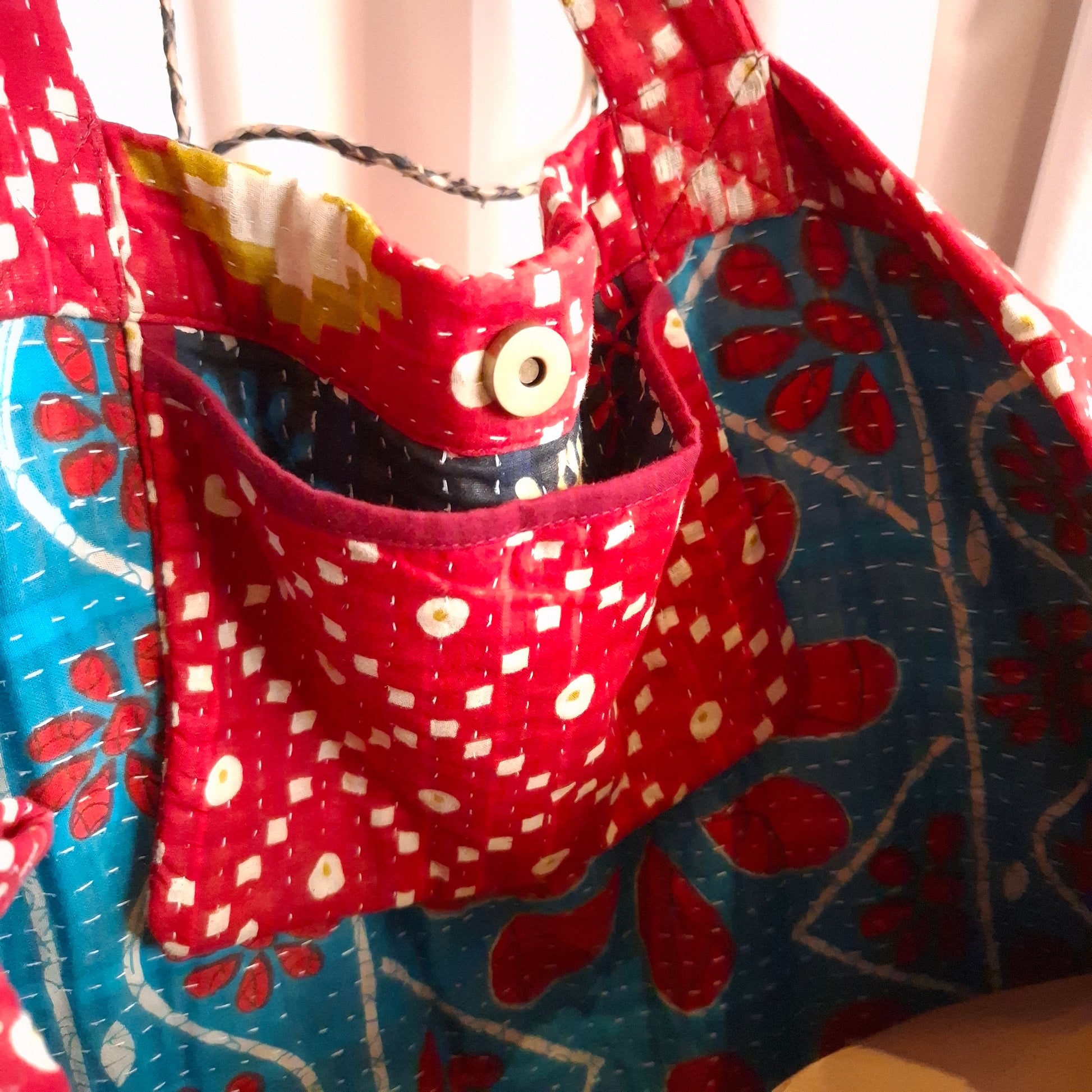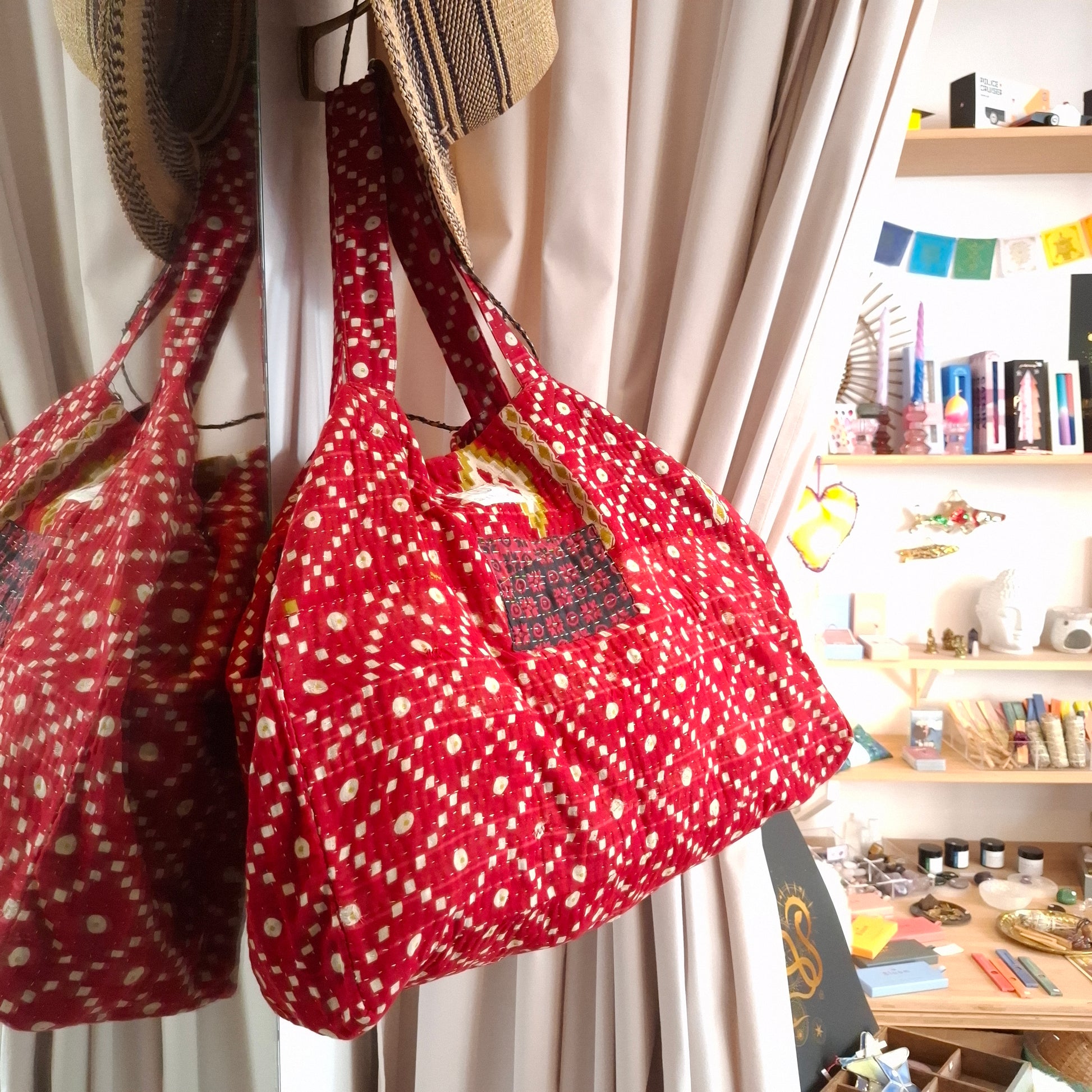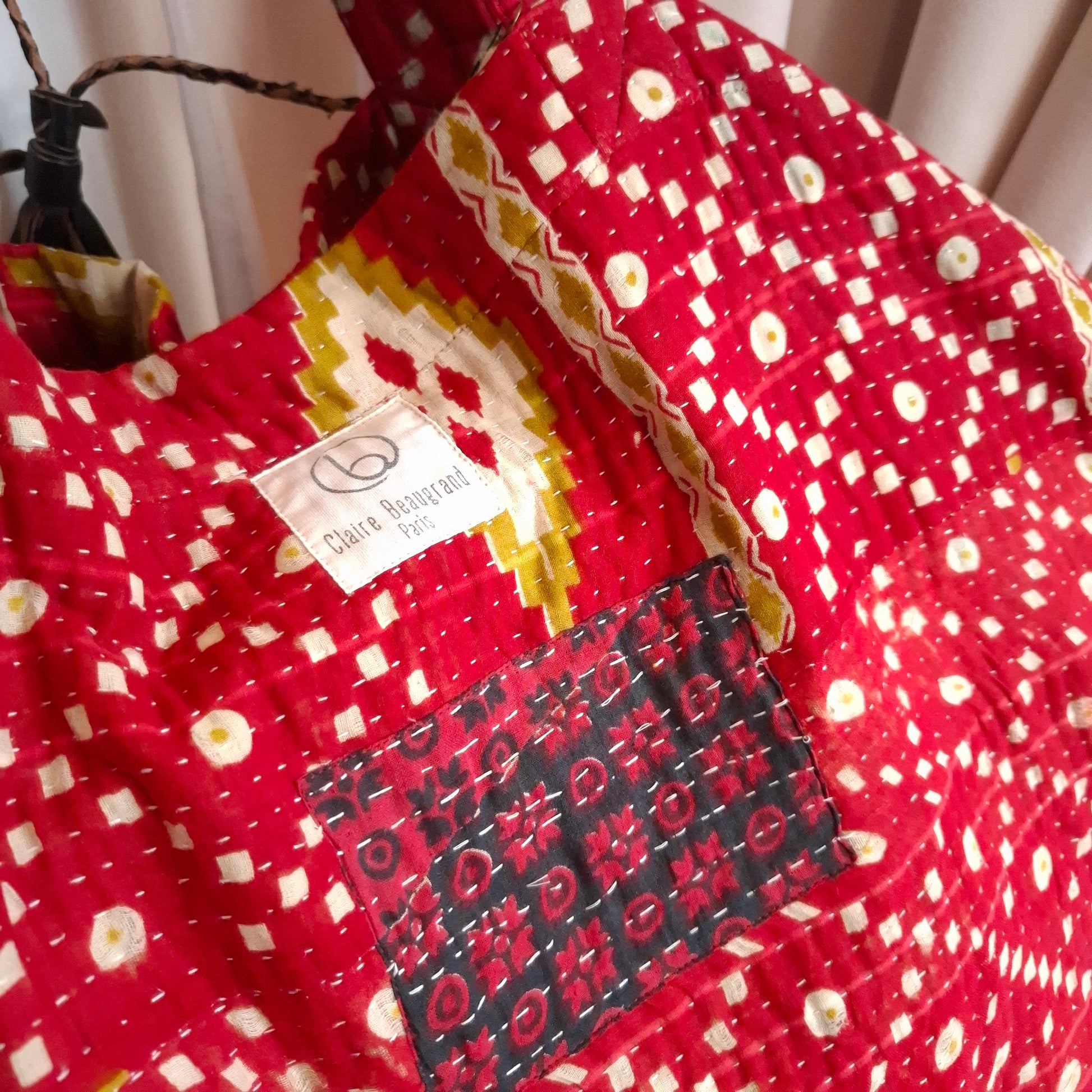 Le kantha est un tissus fait de l’association d’anciens saris indiens assemblés à la main et surpiqués patiemment. Ainsi chaque sac est unique et porte les traces de ce travail qui permet l’émancipation des femmes en Inde.