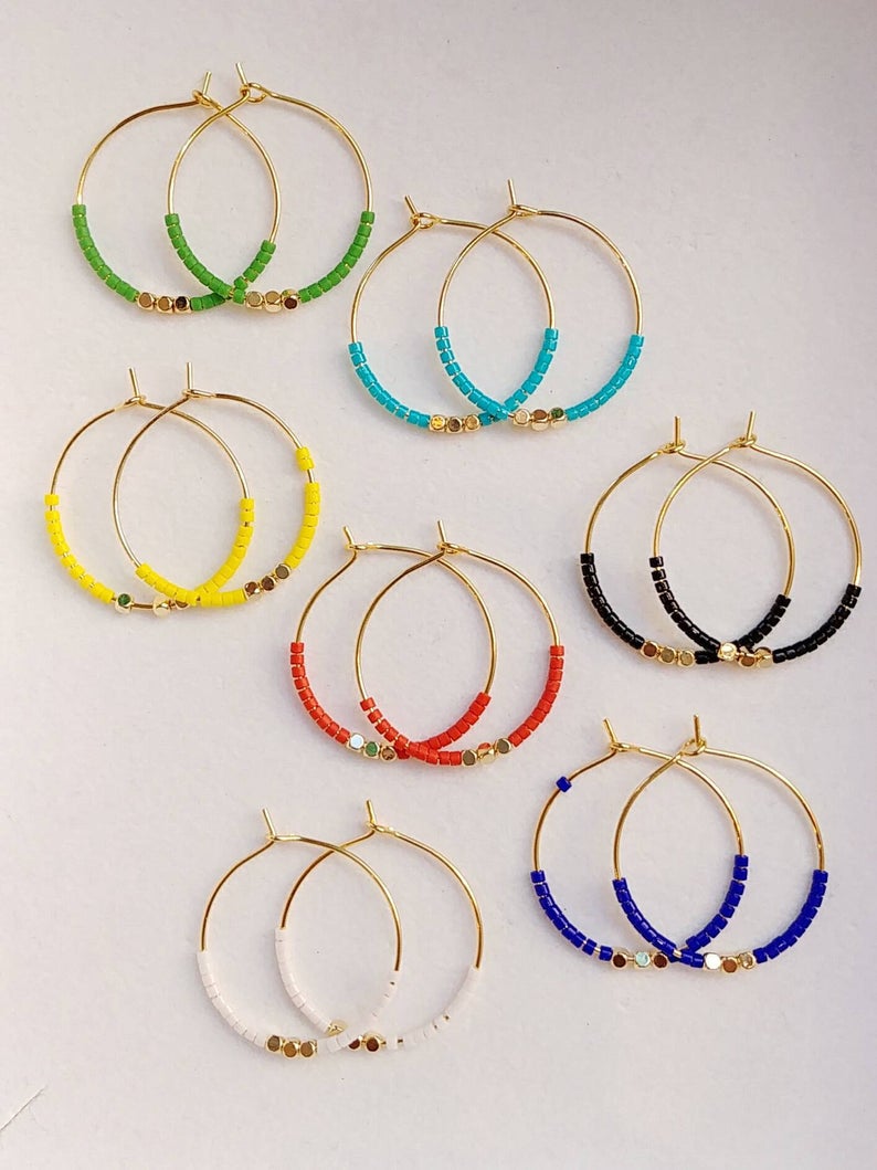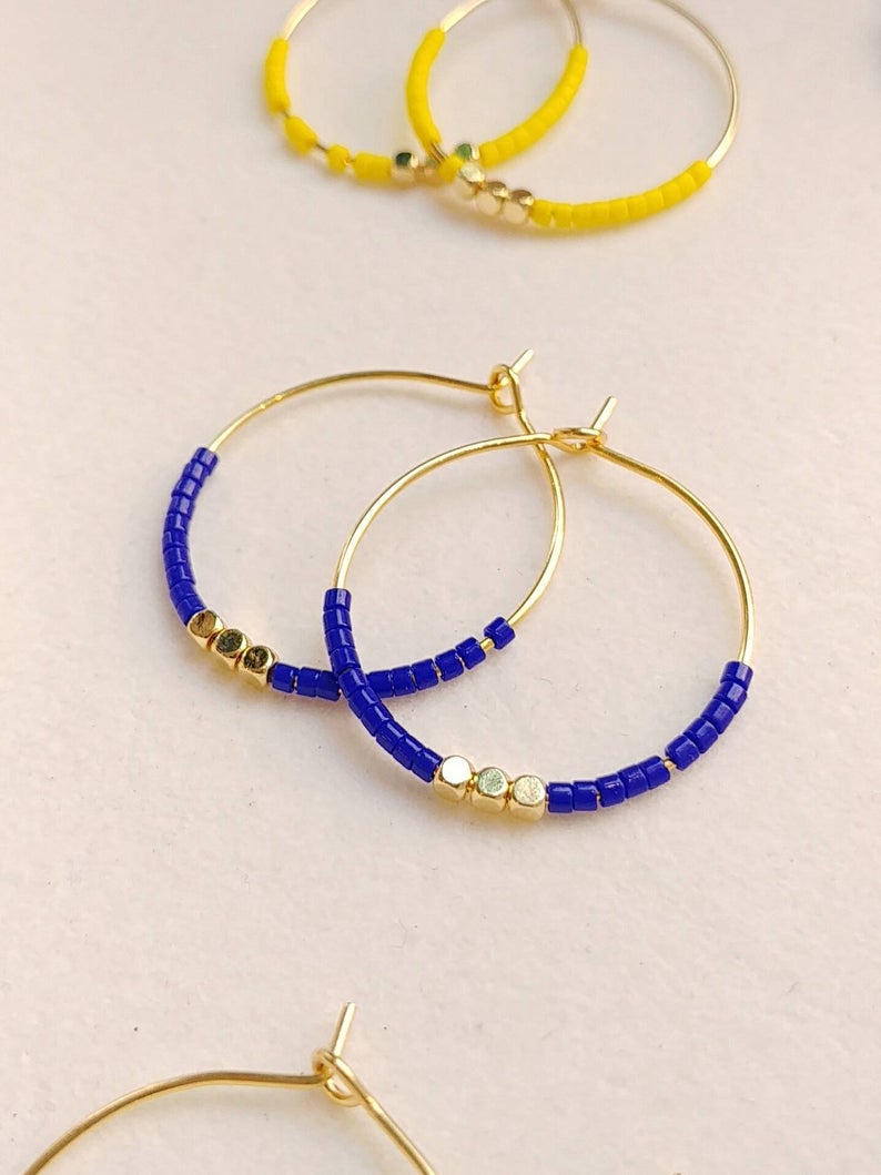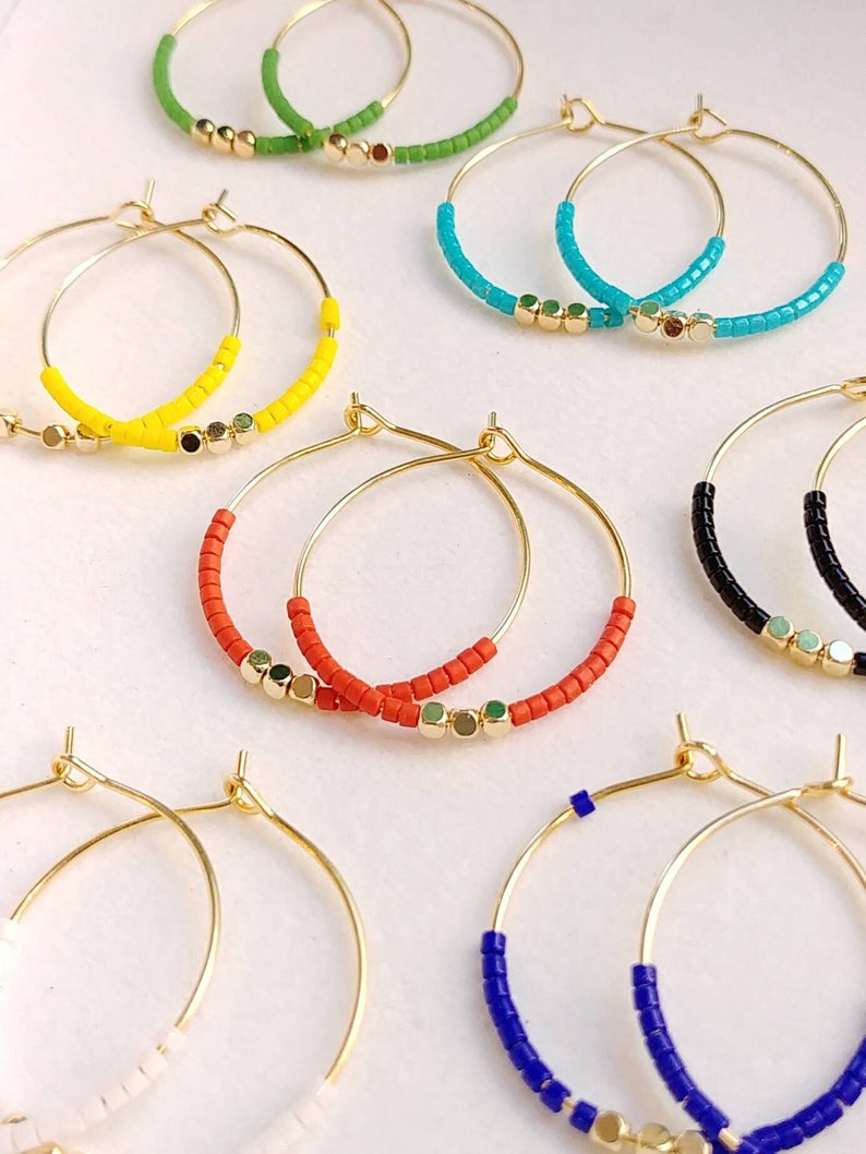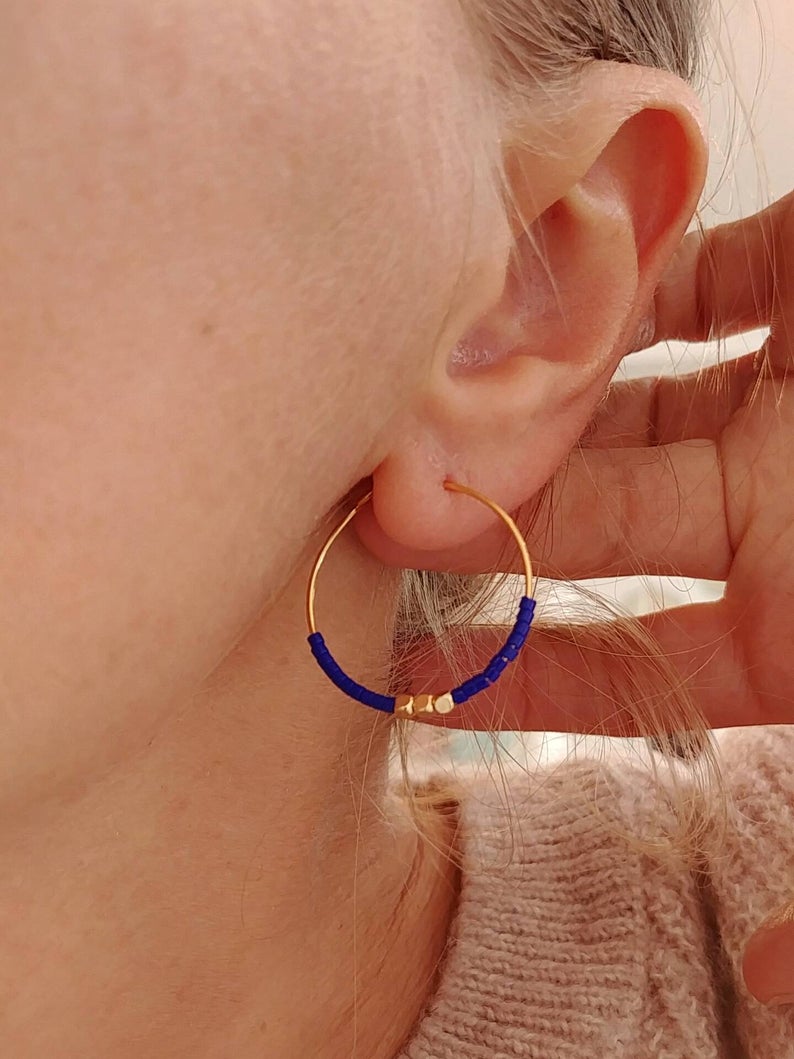 Jolies créoles simples et élégantes, faciles à porter composées d'un anneau doré à l'or fin sur lequel sont enfilées des perles japonaises miyuki très fines et trois petites perles de métal.