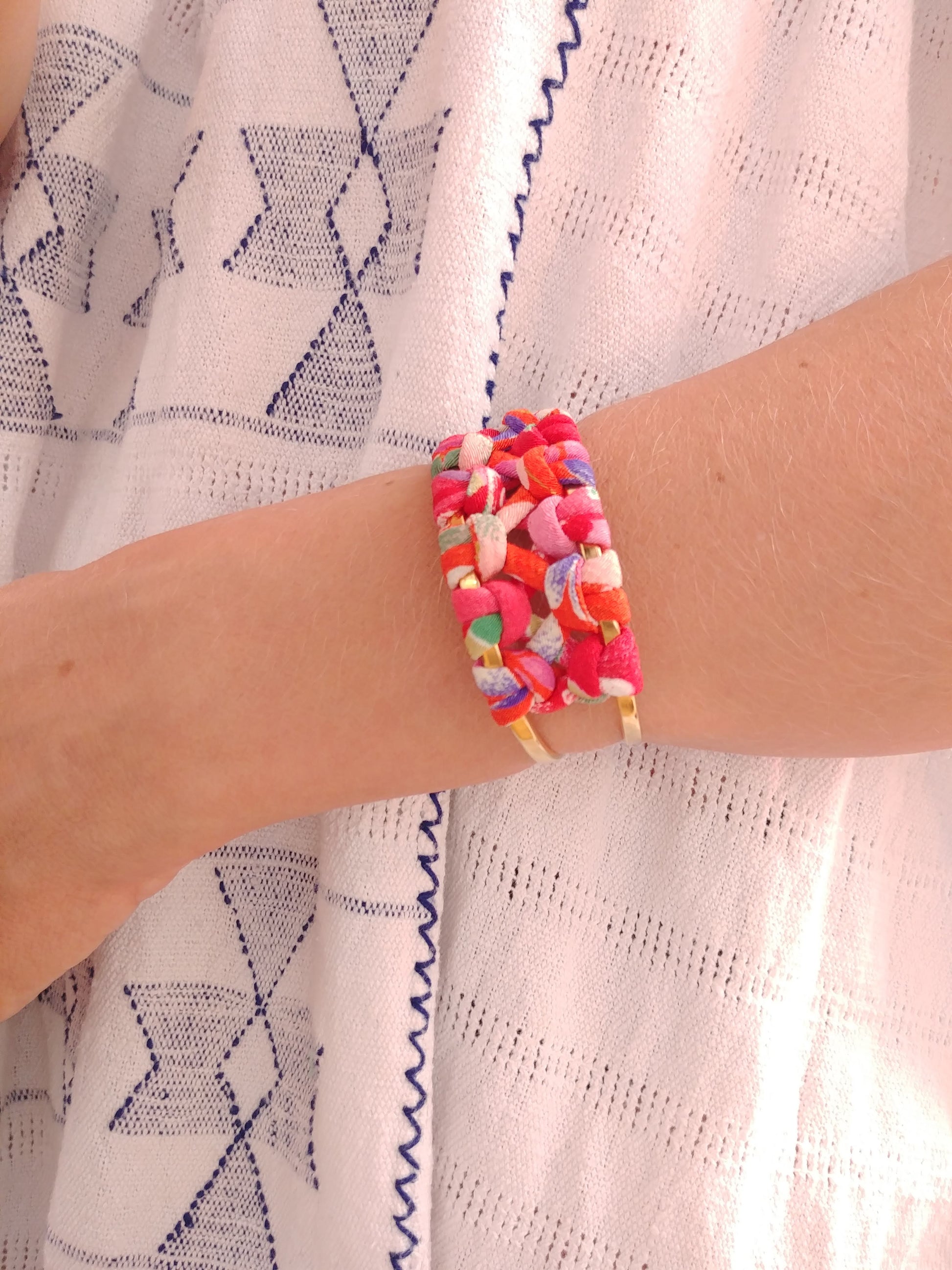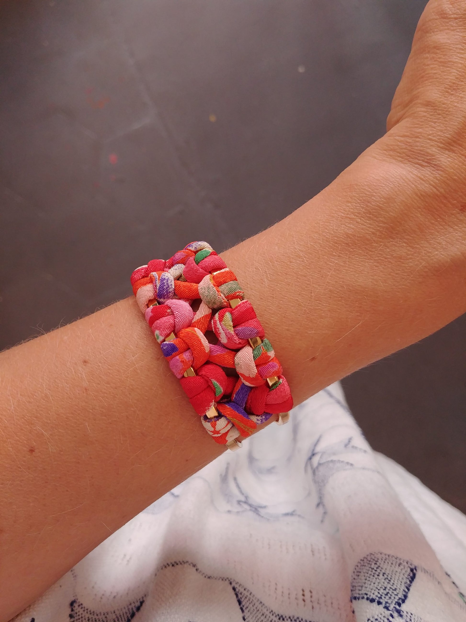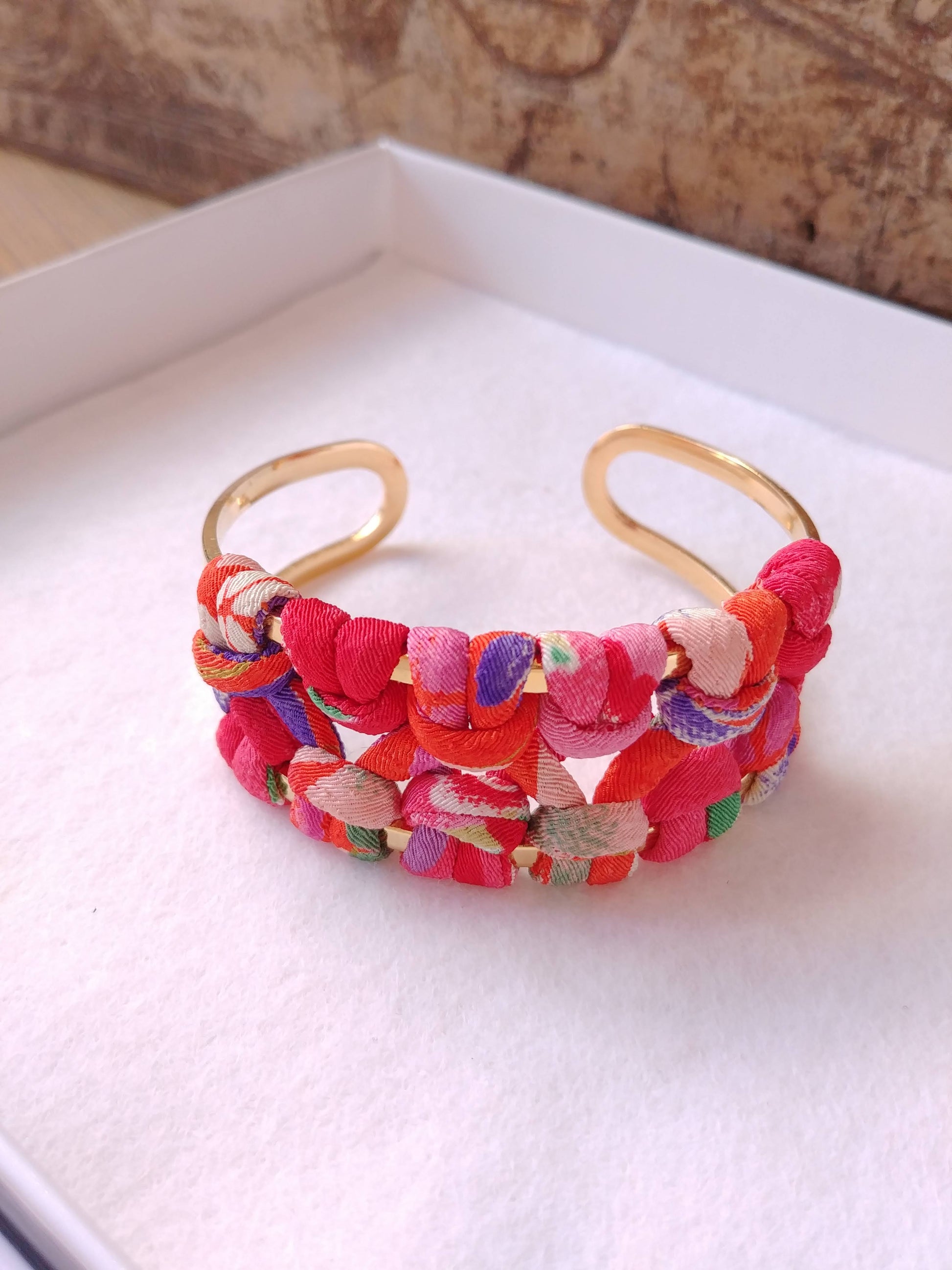 Très jolie manchette en laiton doré à l'or fin réhaussée d'un tressage de liens en tissus japonais. Bijoux, très original et élégant.