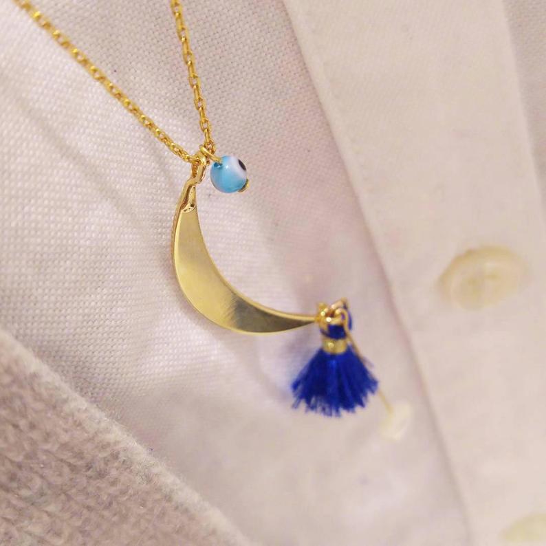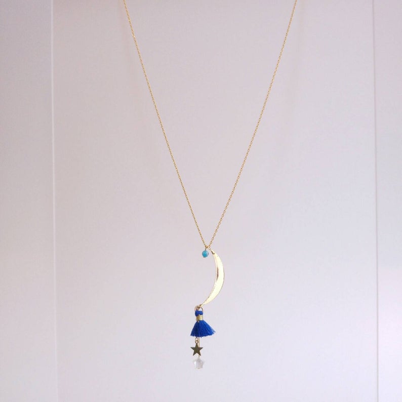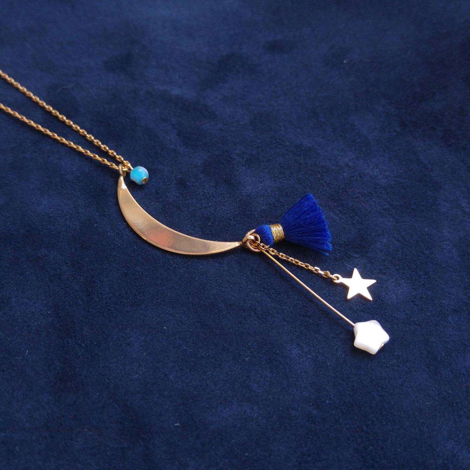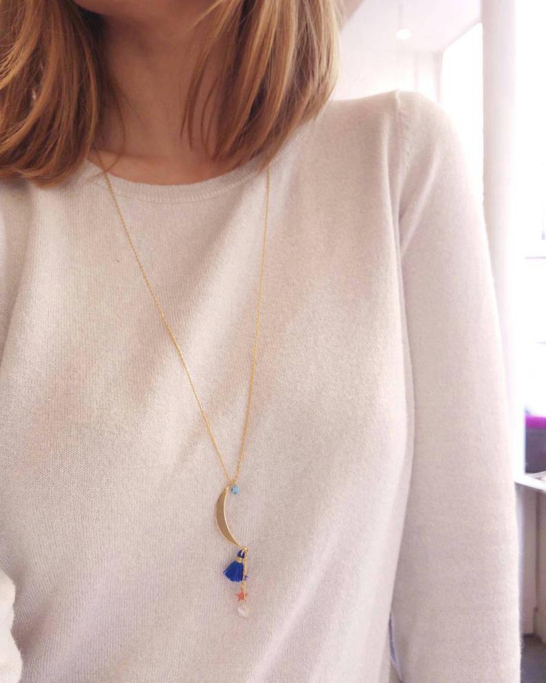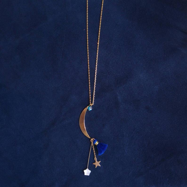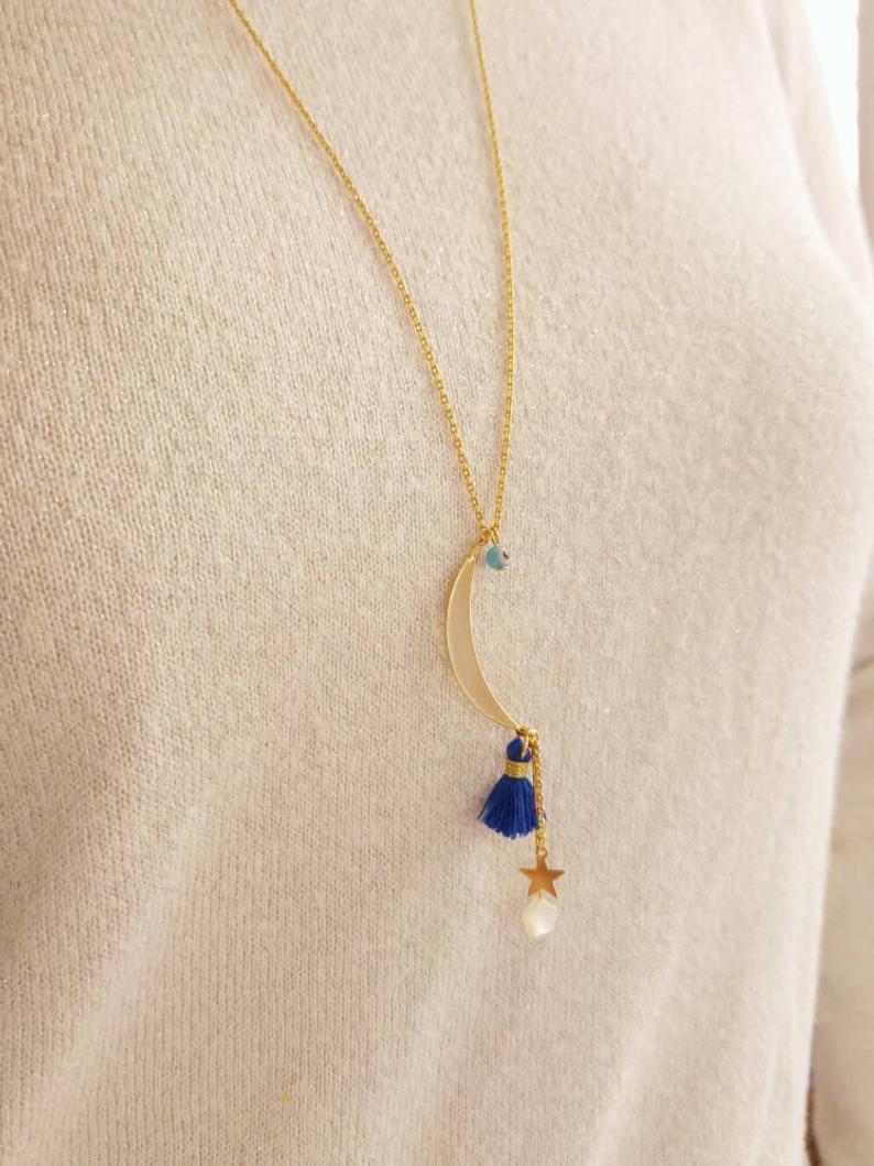 Sautoir constitué d'une chaine fine à maille miroir de 72cm de longueur et d'un pendentif en forme de demi lune. Sur ce pendentif sont accrochés des petites perles et breloques. Pompon, étoile, perles en forme d'oeil porte bonheur...